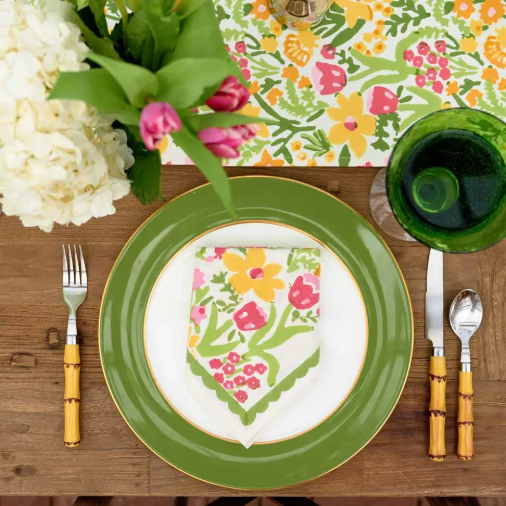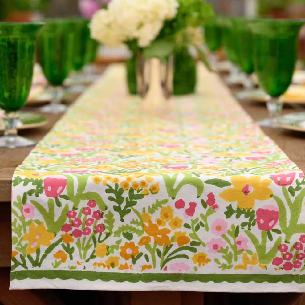 Classic modern retro floral table runner.Pink tulips, yellow daffodils, and lime green leaves adorn this modern classic collection of table linens and kitchen accessories. Fresh from the garden our 70s Flower print table runner will take you back to the 1970s with a retro feel, cheering up your table and home. 100% cotton and handmade in India by skilled artisans for Pomegranate. Table Runner shown.