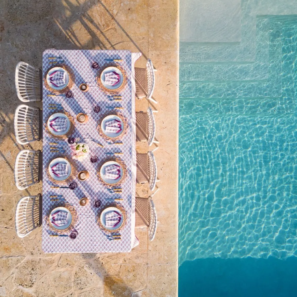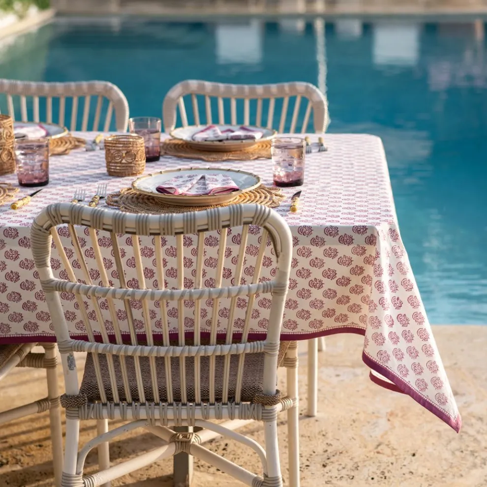 Transform your dining experience with the Anika Fuchsia Tablecloth. Hand-crafted with precision, this stunning tablecloth showcases a delicate hand block-printed floral design. Its elegant yet simple pattern brings a sense of refinement to any table setting, elevating it for both casual gatherings and formal occasions.