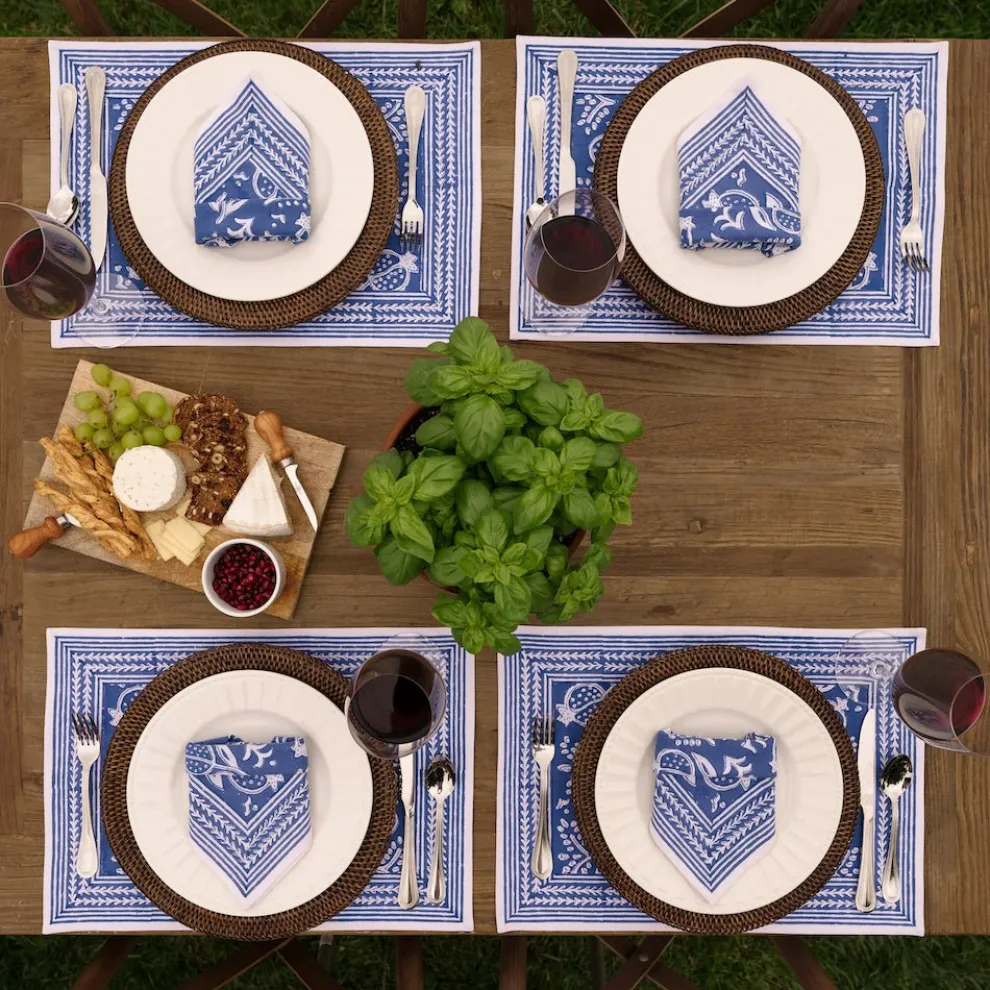 Pomegranate Blue is our brand’s signature print. Decorated in a distinctive, hand painted Pomegranate surrounded by lively fluerettes and a complimentary border, these placemats add a rich layer to your table setting.