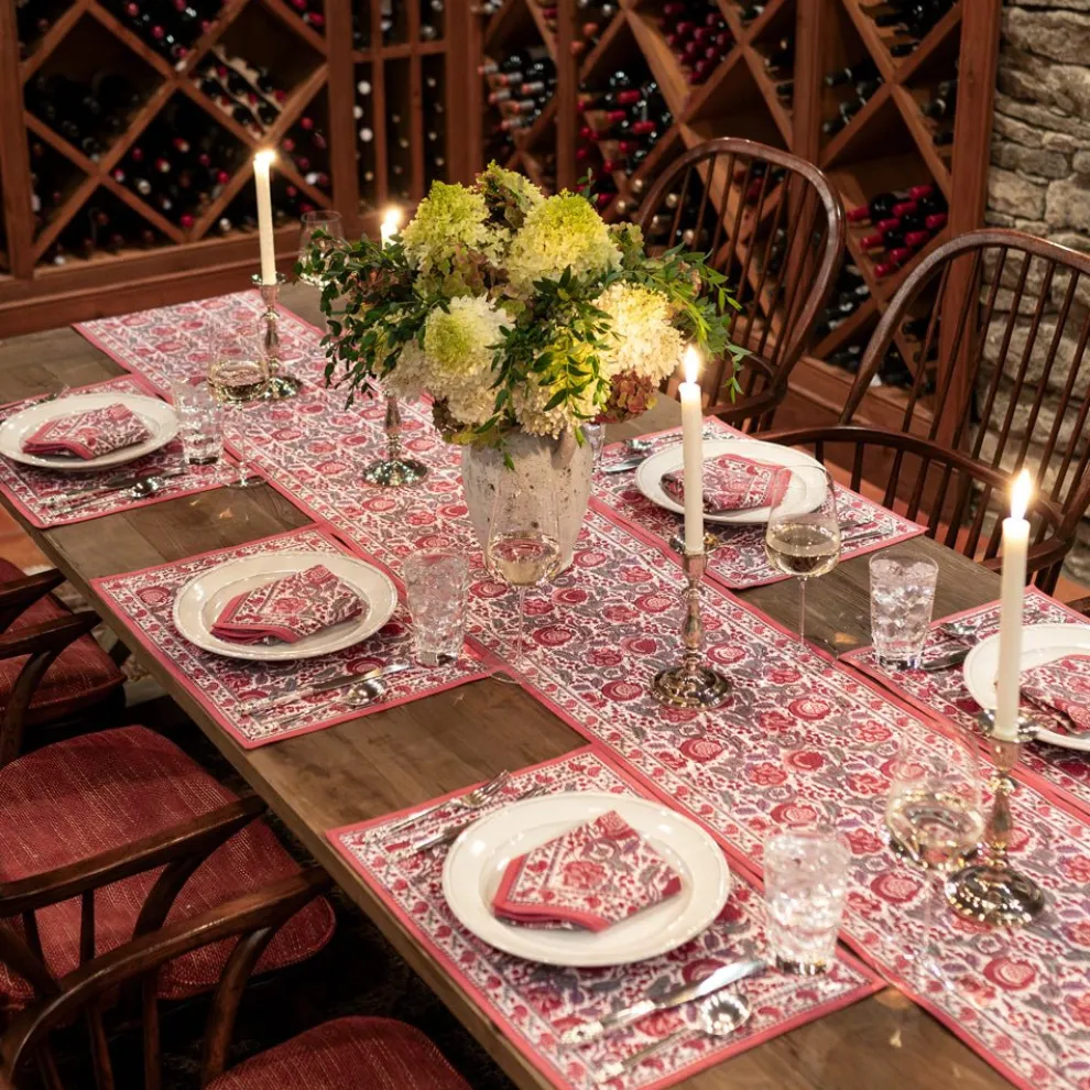 Add a bohemian-inspired centerpiece to your table with the Bohemian Floral Dusty Rose Table Runner. This hand block printed runner features a lush floral pattern that combines deep rose & soft lilac. The intricate design adds depth and character to your dining space. Crafted from 100% cotton, this table runner is both elegant and durable, providing a perfect balance of style and function.