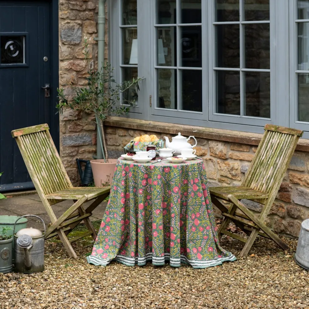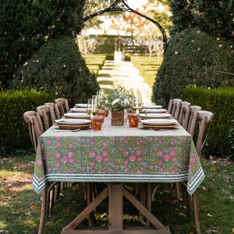 Cool and earthy, this lush botanical green print highlighted with pink blossoms and citrine leaves is perfect for day to night. Sit around your table with boho chic rich hues. Pomegranate tablecloths are casual and elegant, and offered in assorted sizes.