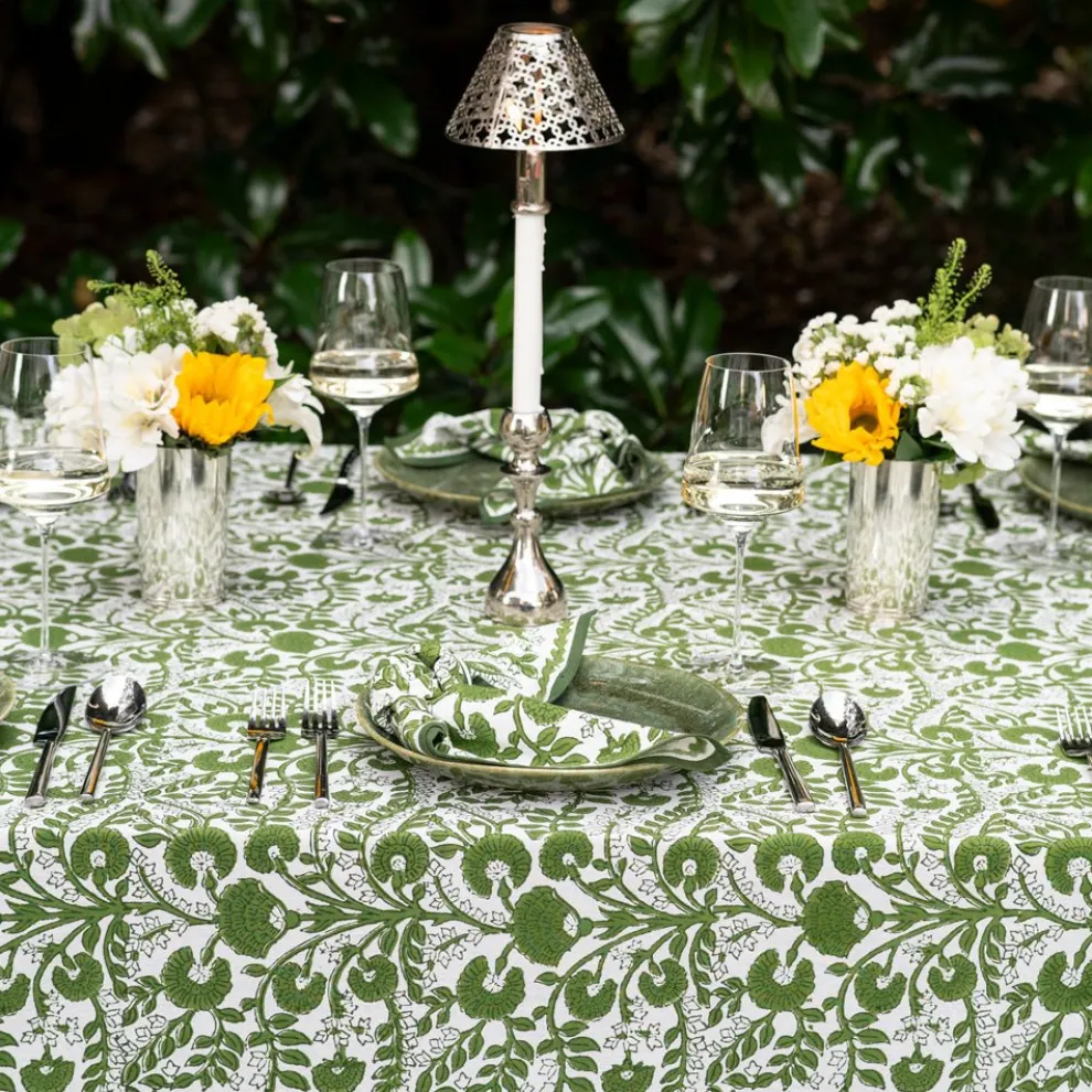 Create a stunning tablescape with the Cactus Flower Lettuce Green Tablecloth. Featuring an exquisite hand block printed design in lettuce green, this tablecloth is crafted from 100% cotton for a soft and durable finish. Its vibrant floral pattern will brighten up any dining area, making it ideal for both everyday meals and special gatherings.