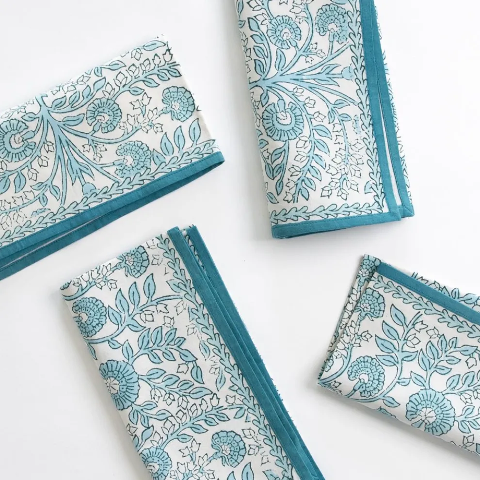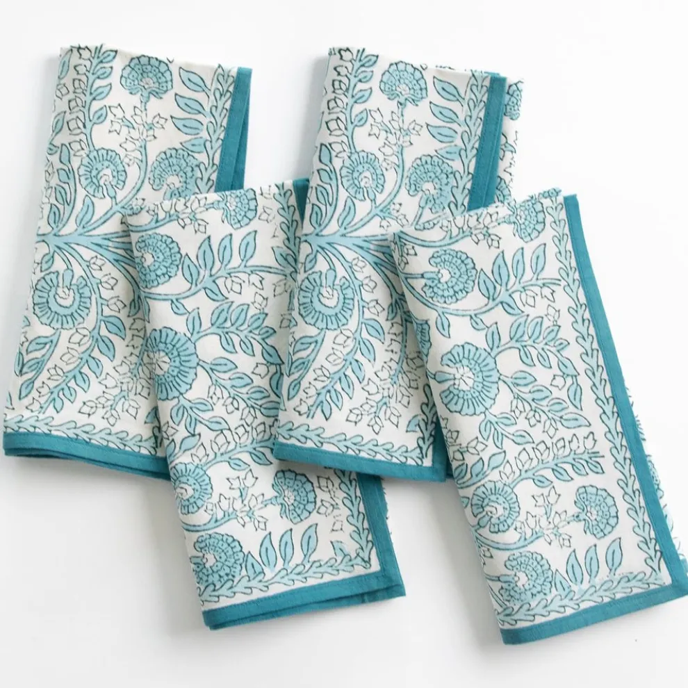 Add a touch of sophistication to your dining table with the Floral Trellis Aqua Napkin set. This set of four napkins showcases a beautiful hand block printed floral pattern in serene aqua blue tones, perfect for enhancing any table setting. Crafted from 100% cotton, these napkins are soft, absorbent, and machine washable, making them a stylish and practical addition to your dining decor.