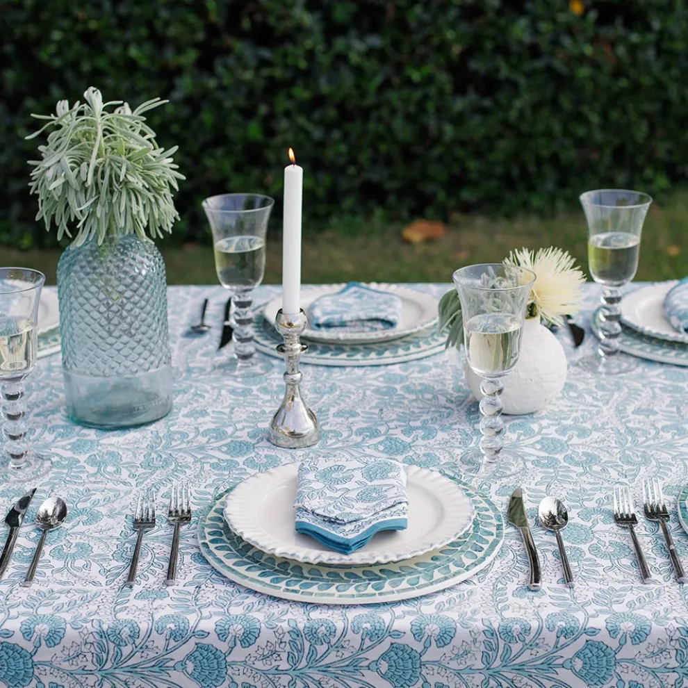 Create a picturesque dining setting with the Floral Trellis Aqua Tablecloth. This exquisite tablecloth features a hand block printed design of intricate floral patterns in soothing aqua blue hues, bringing a sense of calm and sophistication to your meals. Made from 100% cotton, it is not only beautiful but also durable and machine washable, ensuring it remains a centerpiece of your dining decor for years to come.