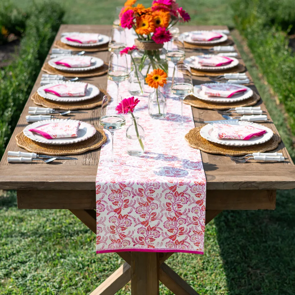 Create an inviting tablescape with the Gardenia Vine Berry Table Runner. This hand block-printed masterpiece features an intricate floral design in vivid berry pink tones, offering a stunning centerpiece for any table setting. Made from 100% cotton, it’s lightweight, machine washable, and ideal for enhancing your dining décor.