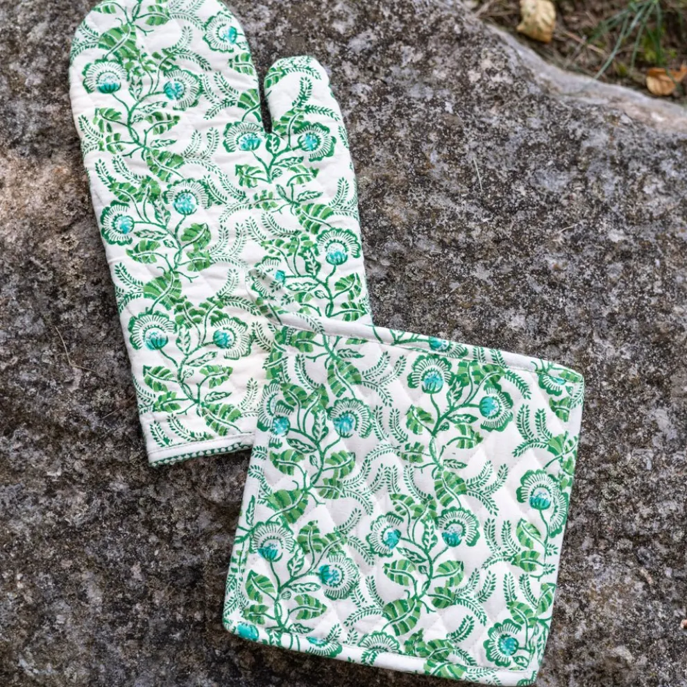 Our Gardenia Vine Emerald Oven Mitt Set features a beautiful green floral design. Crafted from 100% cotton, these mitts provide heat resistance and a comfortable grip. Ideal for everyday baking and cooking, they bring function and charm to any kitchen.
