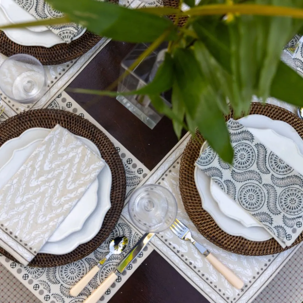 In the olden days, what we now see as the gold shoulder braid on high-ranking officers—called an aiguillette (pronounced “egg-wee-let”)—was originally just rope and pegs. It was carried on the shoulder by a knight’s aide-de-camp, ready to tether the knight’s horse. The ornamental braided cords with decorative metal tips are now worn on uniforms by officers to distinguish special and senior appointments, but wouldn’t it be fun if they were still used to tether the occasional horse? This hand block printed Chevron patterned napkin set draws its inspiration from those striking gold braids.It’s a modern take on tradition, perfect for bringing a bit of timeless style to any setting.