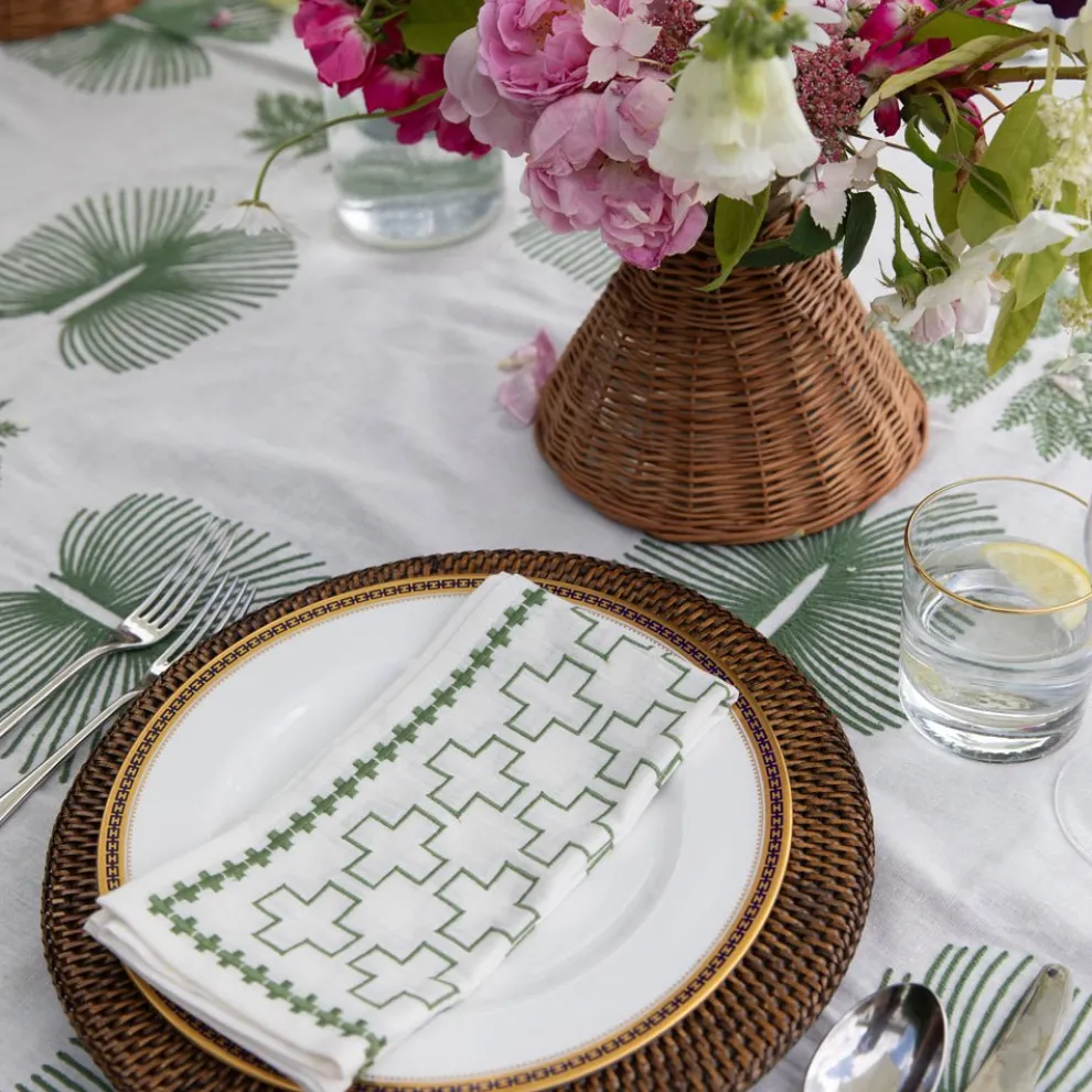 The India Hicks Home Embroidered Grand Cross napkins are embroidered in India by skilled artisans using hand-guided embroidery techniques. The beautiful cotton blend fabric has a slight stretch and resilience to it, creating a keepsake that can be brought out for your favorite dinner guests for years to come.