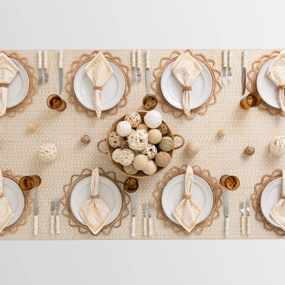 We seized the power of color and pattern to fill our Endless Summer Collectionwith optimism and joy. Our Palm AvenueGoldenTablecloth isinspired by the GOLDENsunshine of a Bahamas summer day, andpatterns borrowed from the reassuring avenue of palm trees that have stood proud in our garden.