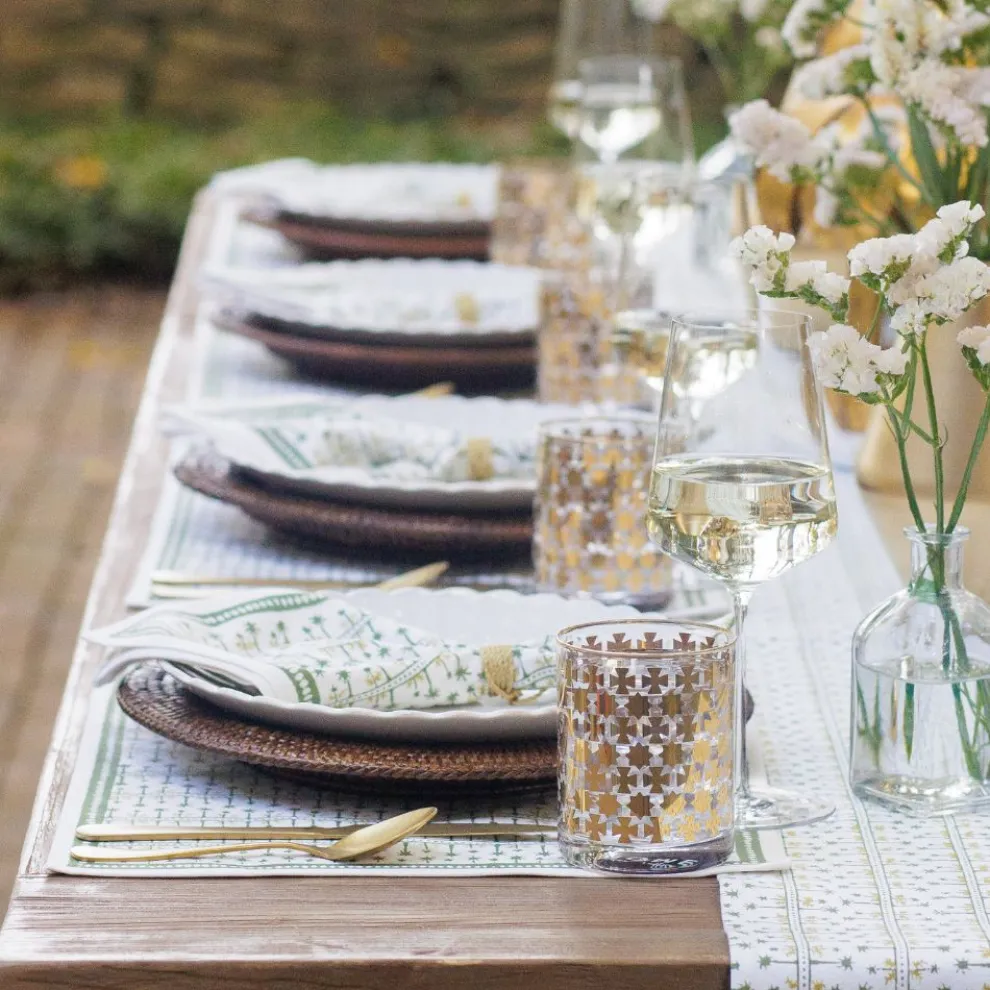 These placemats were inspired by India’s life on Harbour Island. When she first moved to the Bahamas, her family planted an avenue of baby palm trees, now several years later they lay up the family dining table under the shade of these tall majestic trees. The beautiful palm tree pattern is now available in an iconic hunter green hue, laying the perfect foundation for any occasion, from al fresco dining to holiday gatherings.