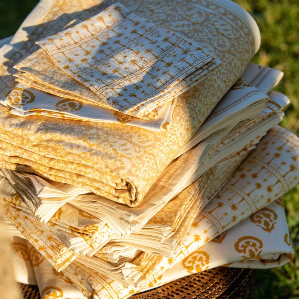 This beautiful 100% cotton, hand blocked printedTablecloth inSeashellGolden is intended to be mixed haphazardly together with the other patterns, just as our families are.