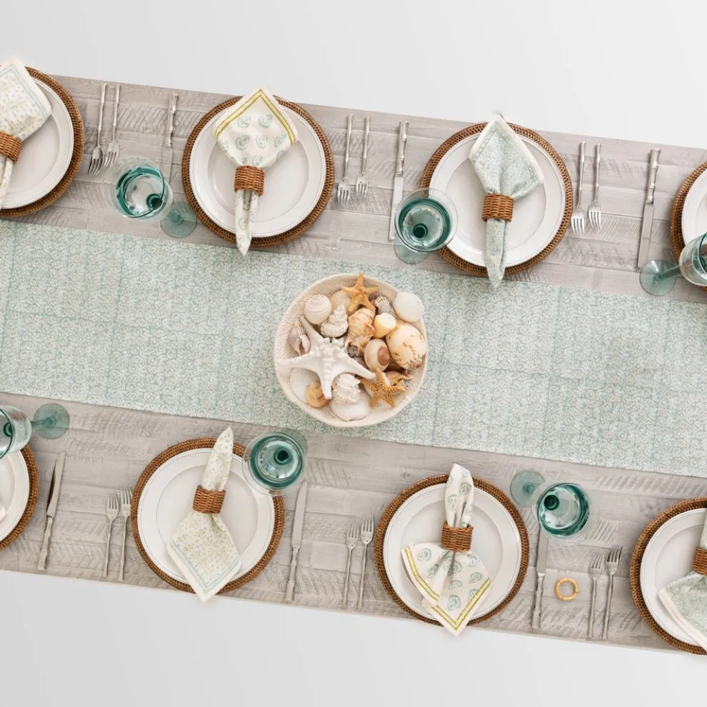 This beautiful 100% cotton, hand blocked printedTable Runner inSeashellSeafoamis intended to be mixed haphazardly together with the other patterns, just as our families are.