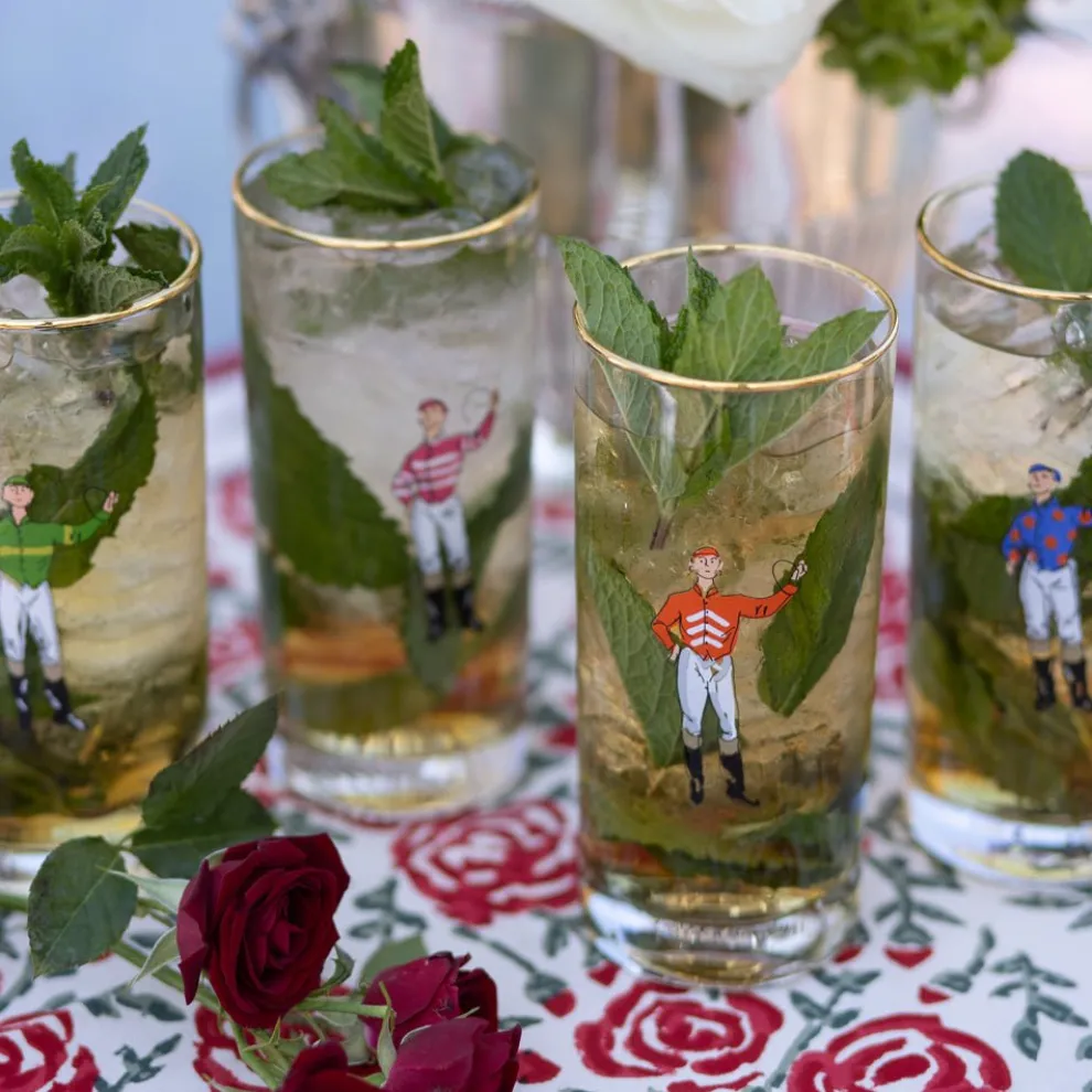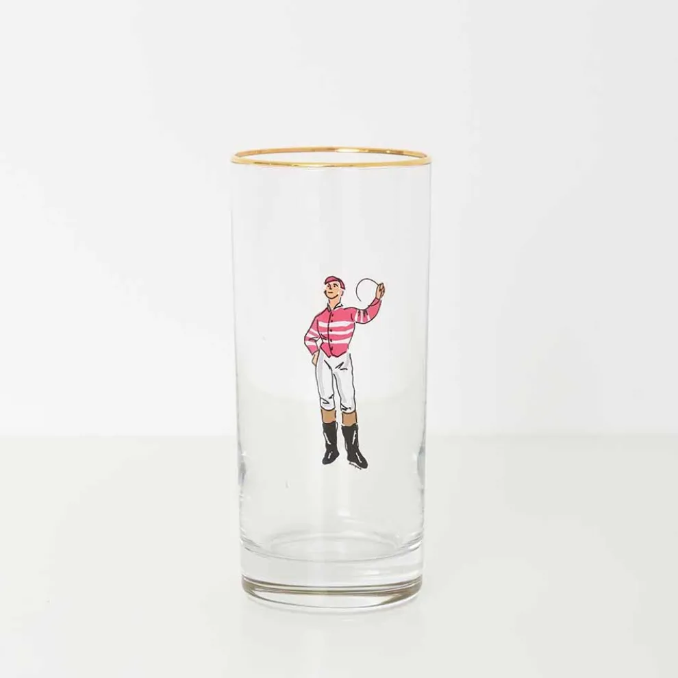 Off to the races! For the equestrian enthusiast, elevate your glassware collection with our Jockey Silks Highball Glasses. Featuring four unique jockeys in bright colored silks and a gold metallic rim, this glass brings sophistication to both everyday and formal gatherings.