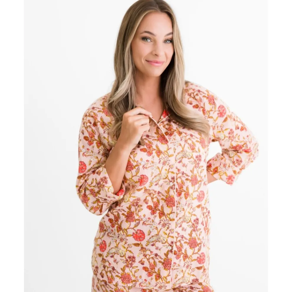 Slink into something a little more comfortable and stylish with the Mila Floral Blush PJ Top! This blush-colored cotton button-down is as cuddly as it is cute with its colorful coral and pink floral pattern. And the long sleeves mean you don’t have to sacrifice any coziness! Snuggle up in style!