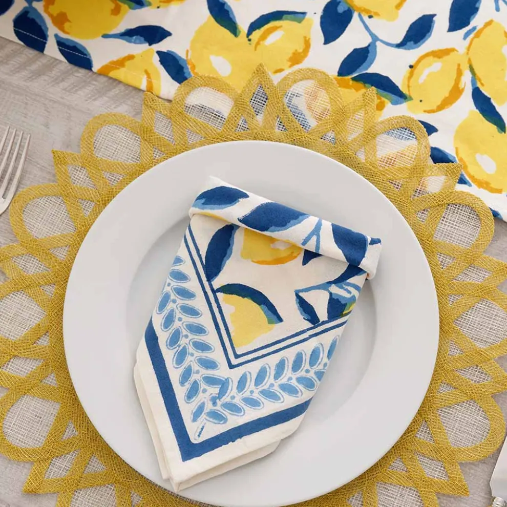 We all love lemons…and the combo of blue and yellow is just amazing on this exclusive print. The block printed napkins are sure to put a smile on every table they meet!