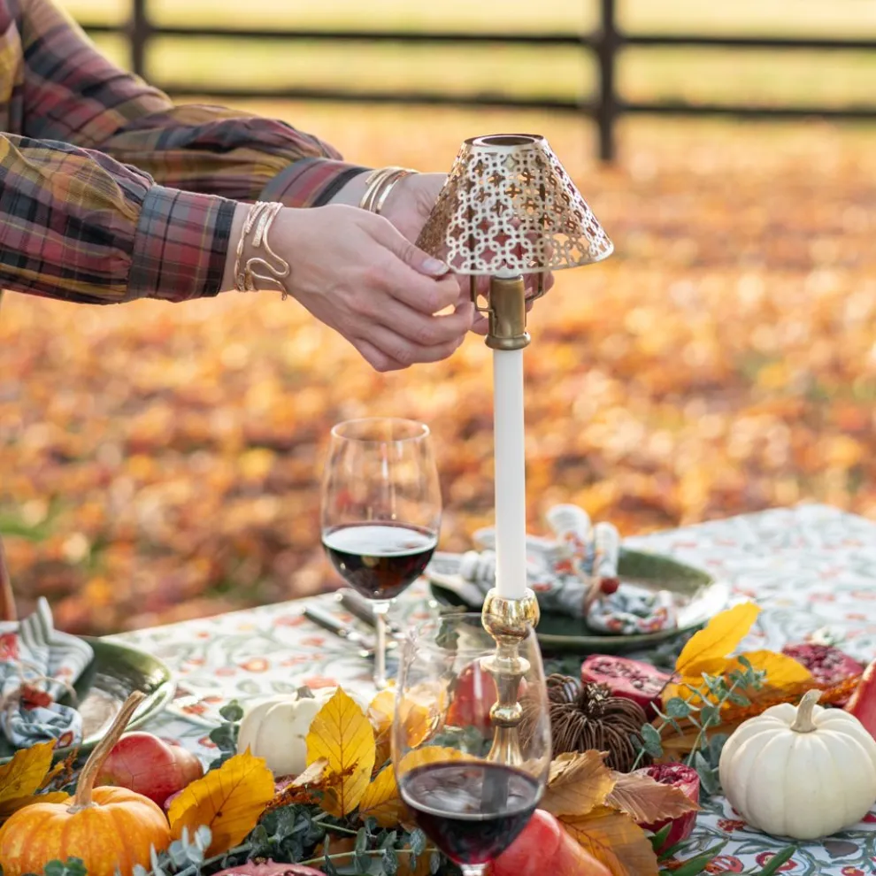 Our modern candlestick and cutwork shade comes in gold, silver, and bronze. This is a perfect addition for elevated, cozy gatherings around the table and home this fall and winter. Keep the candlestick shade or take it off, perfect for versatile entertaining.