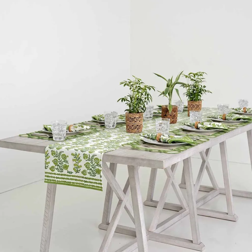 This cheerful hand block printed table runner will brighten up your table and cheer up your day. Perfect for casual everyday use as well as entertaining and gatherings with family and friends. Inside, outside, in the garden and up in the mountains, they fit in everywhere! Pair with matching tablecloths and napkins set to complete the elegant yet casual look.