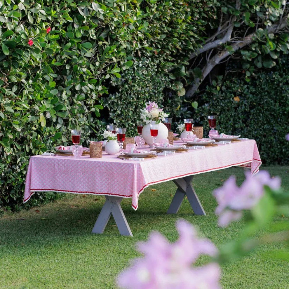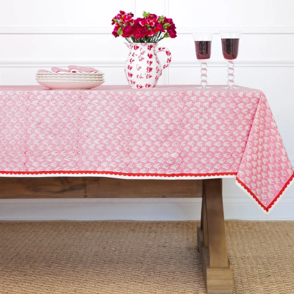 Transform your table into a celebration of color with our Pom Buti Pink Tablecloth. This hand block-printed piece showcases a charming floral motif against a soft pink background, framed by a red scalloped border. Perfect for entertaining or simply elevating everyday dining, this tablecloth is a must-have for creating a warm and welcoming atmosphere.