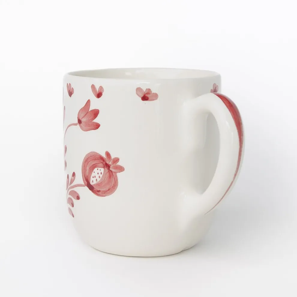 Enjoy your favorite beverages with the Pomegranate Duet Rose Mugs. These beautifully hand-painted mugs feature a delicate pomegranate design framed by soft floral elements in rose pink. Perfect for sipping tea, coffee, or hot cocoa, these mugs offer a delightful balance of style and comfort. The set of 2 makes a lovely addition to any kitchen collection or a thoughtful gift.
