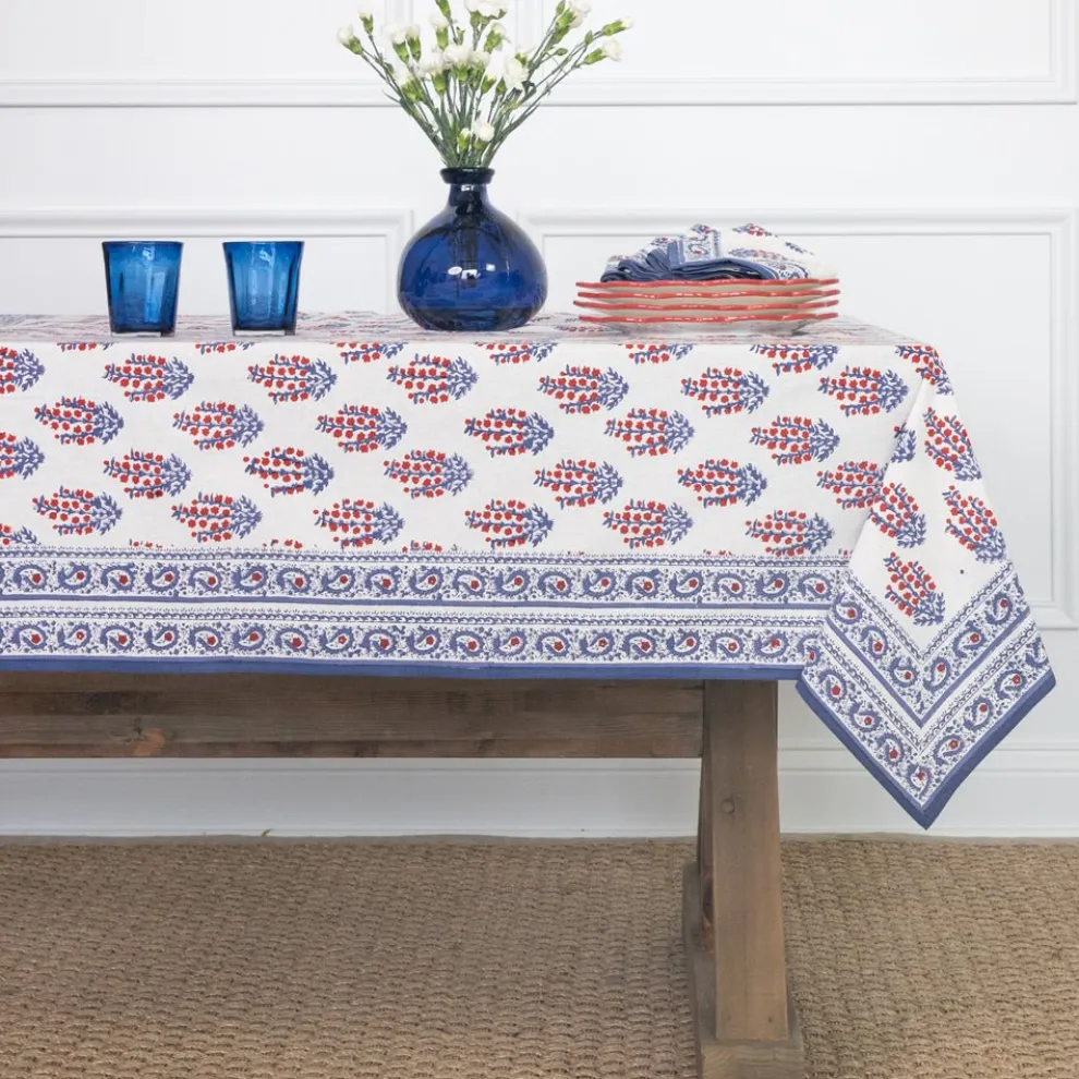 Infuse your dining room with the cultural charm of Central India’s Sagar District with our Sagar Red & Blue Tablecloth. Featuring a hand block printed botanical design in vibrant red and soothing blue tones, this tablecloth is a true testament to the region’s beauty. Made from premium fabric, it not only adds a touch of elegance to your table setting but also provides durability and easy maintenance, making it a perfect choice for any occasion.