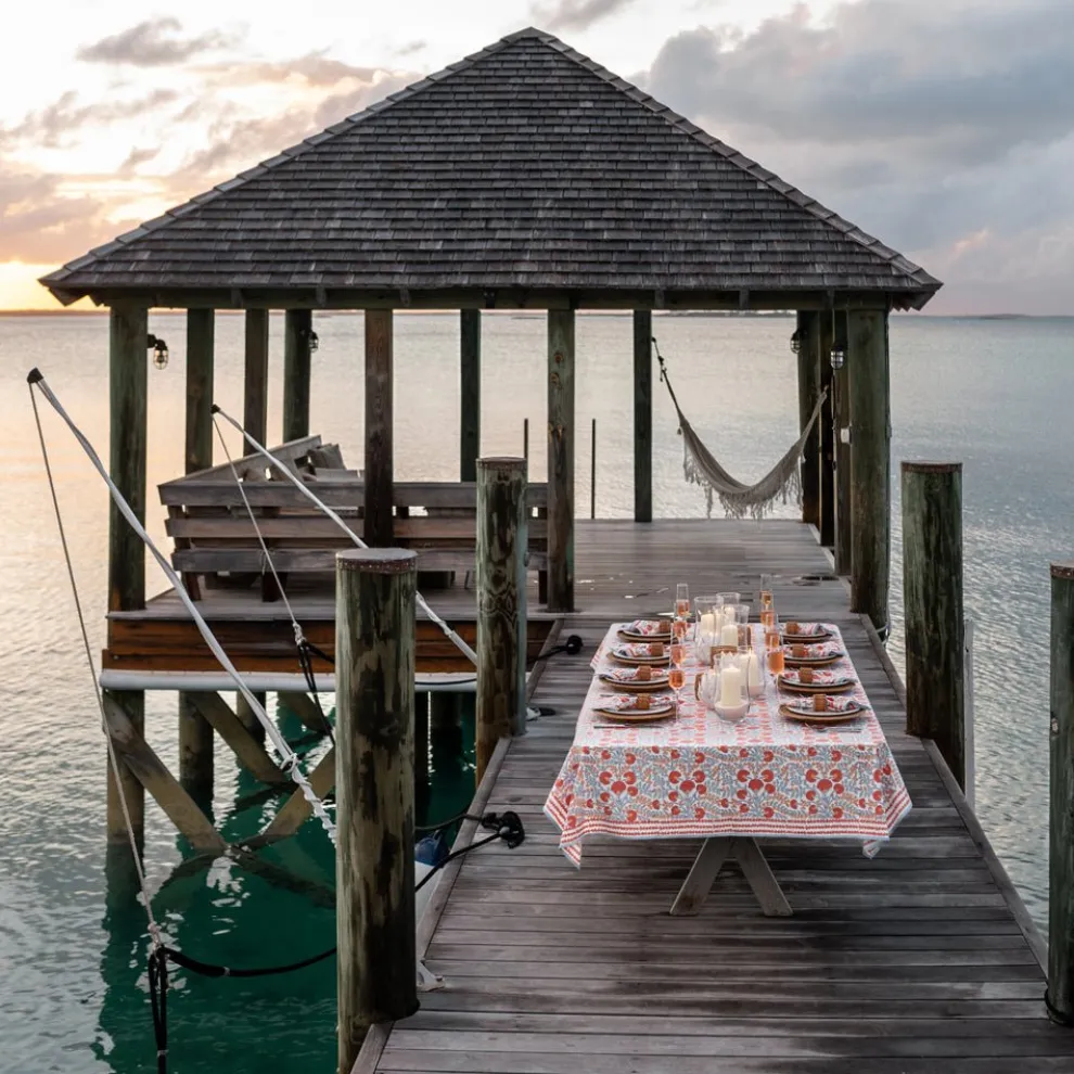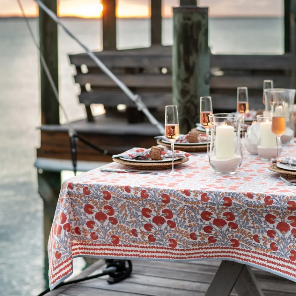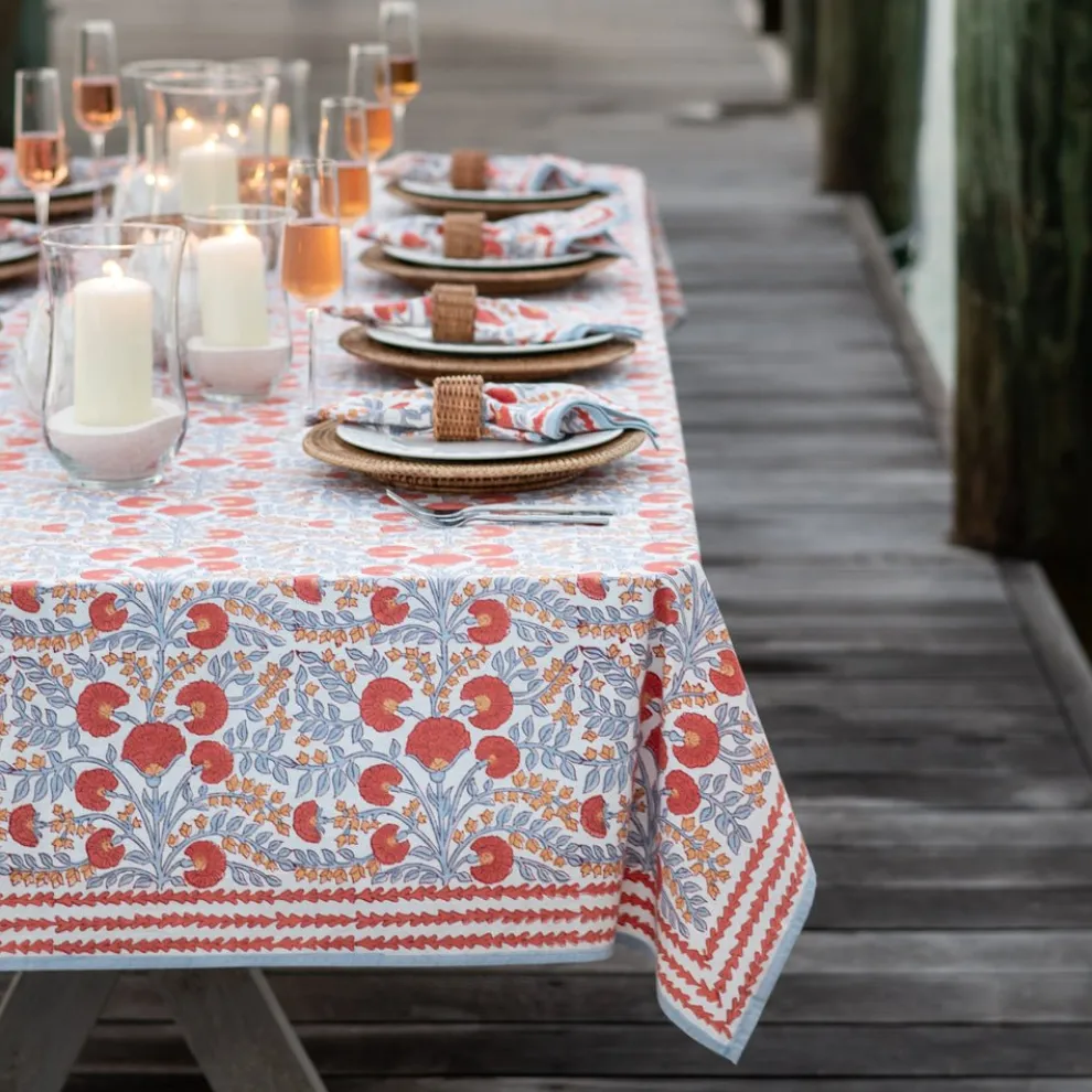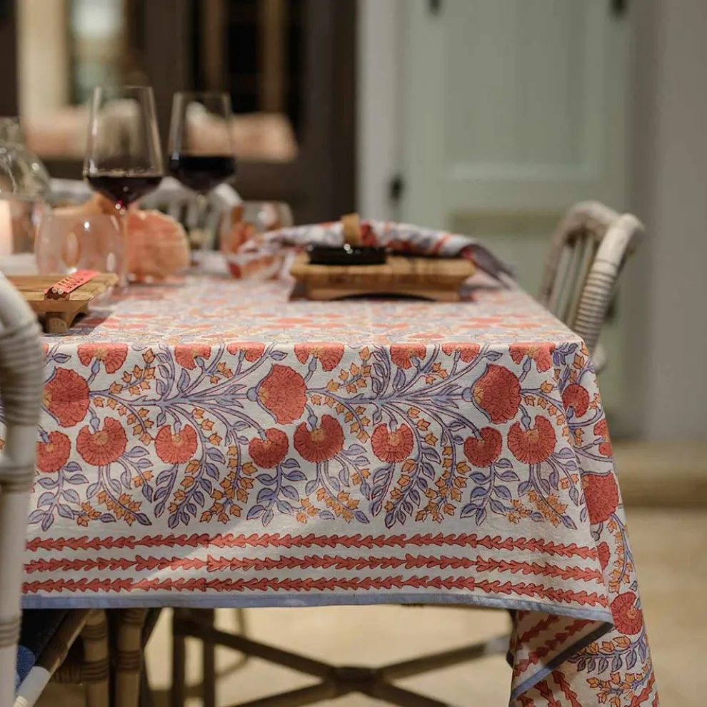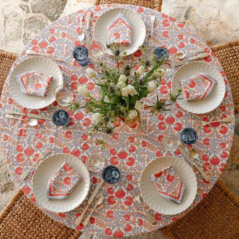 Introducing a beautiful new print that is predicted to be a best seller year round! This floral print showcases periwinkle vines with warm orange blooms and earthy undertones. Perfect for day or night and all seasons, it is sure to bring a colorful but calming energy to your dining experience.