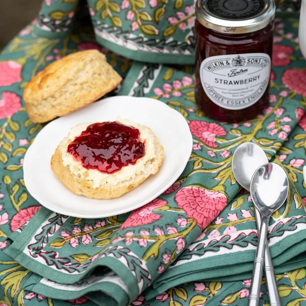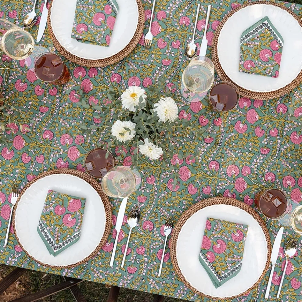 Cool and earthy, this lush botanical green print highlighted with pink blossoms and citrine leaves is perfect for day to night. Sit around your table with boho chic rich hues. These fabulous napkins will recharge and update your table. Coordinating tablecloths, table runners and placemats complete the set.
