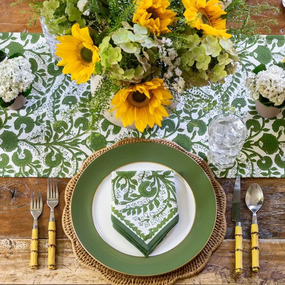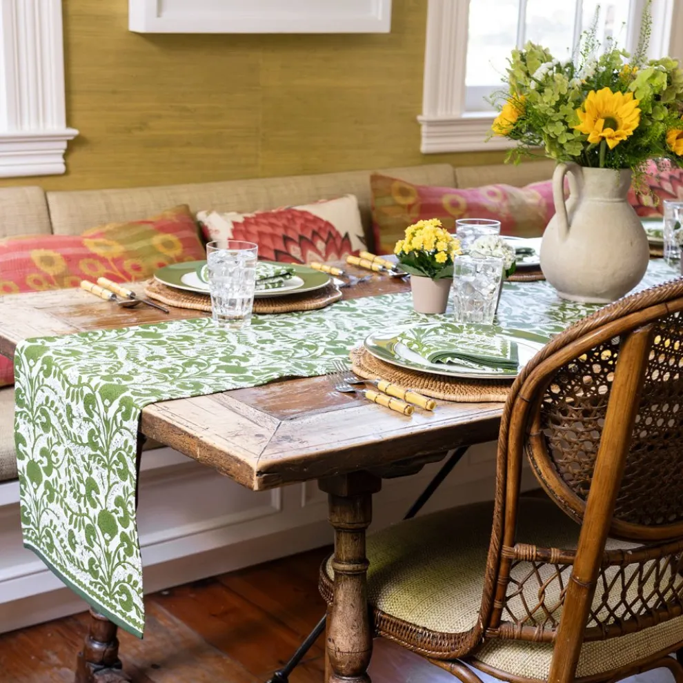 Add a touch of elegance to your dining table with the Cactus Flower Lettuce Green Table Runner. Hand block printed with a detailed floral pattern in a vibrant green, this table runner is perfect for bringing a fresh and inviting look to your table setting. Made from 100% cotton, it is both durable and easy to care for, making it a practical yet beautiful addition to your decor.