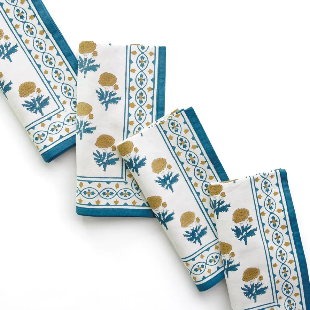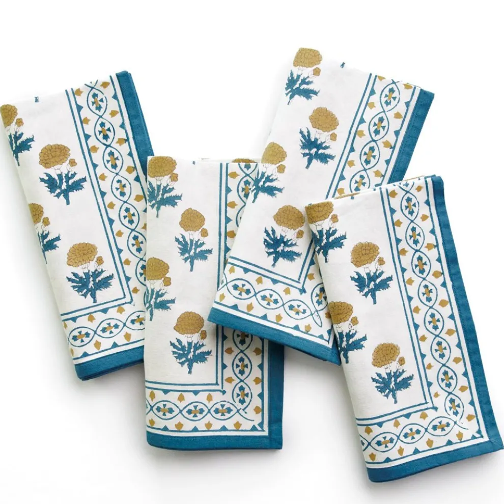 Named after an ancient and holy city in India, our Gaya Teal & Marigold Napkins capture the splendor, mystery and beauty of the Asian subcontinent. Printed by hand using rich dyes and carved wooden blocks to achieve a one-of a-kind design, these cotton dinner napkins make a striking display on your formal tabletop.