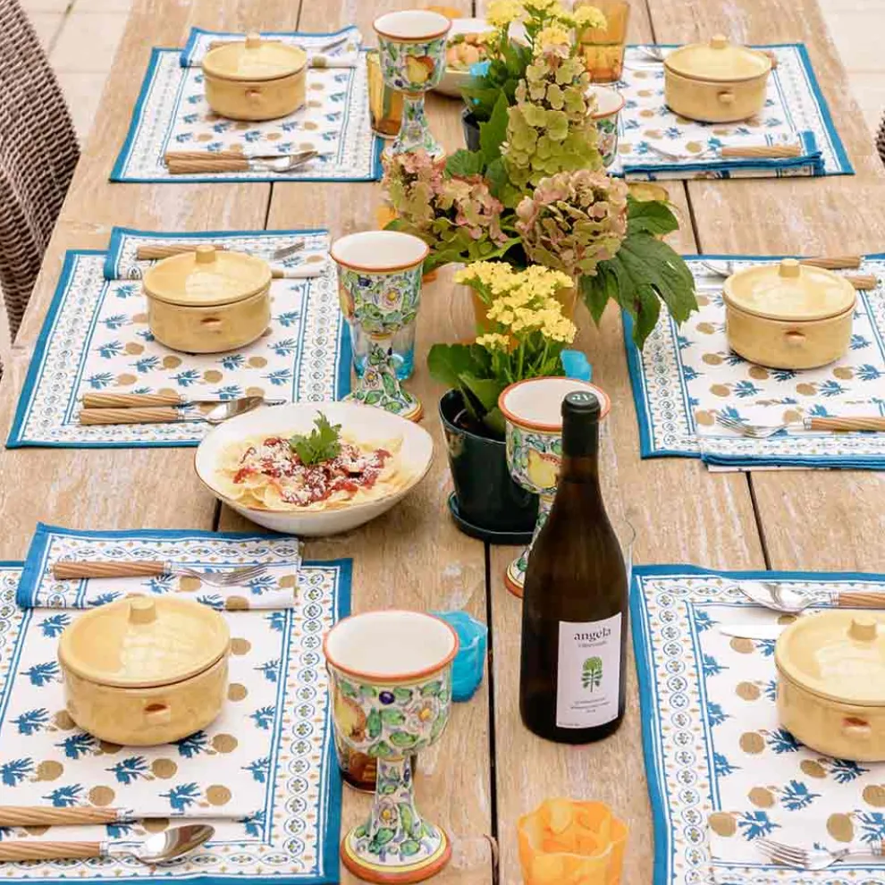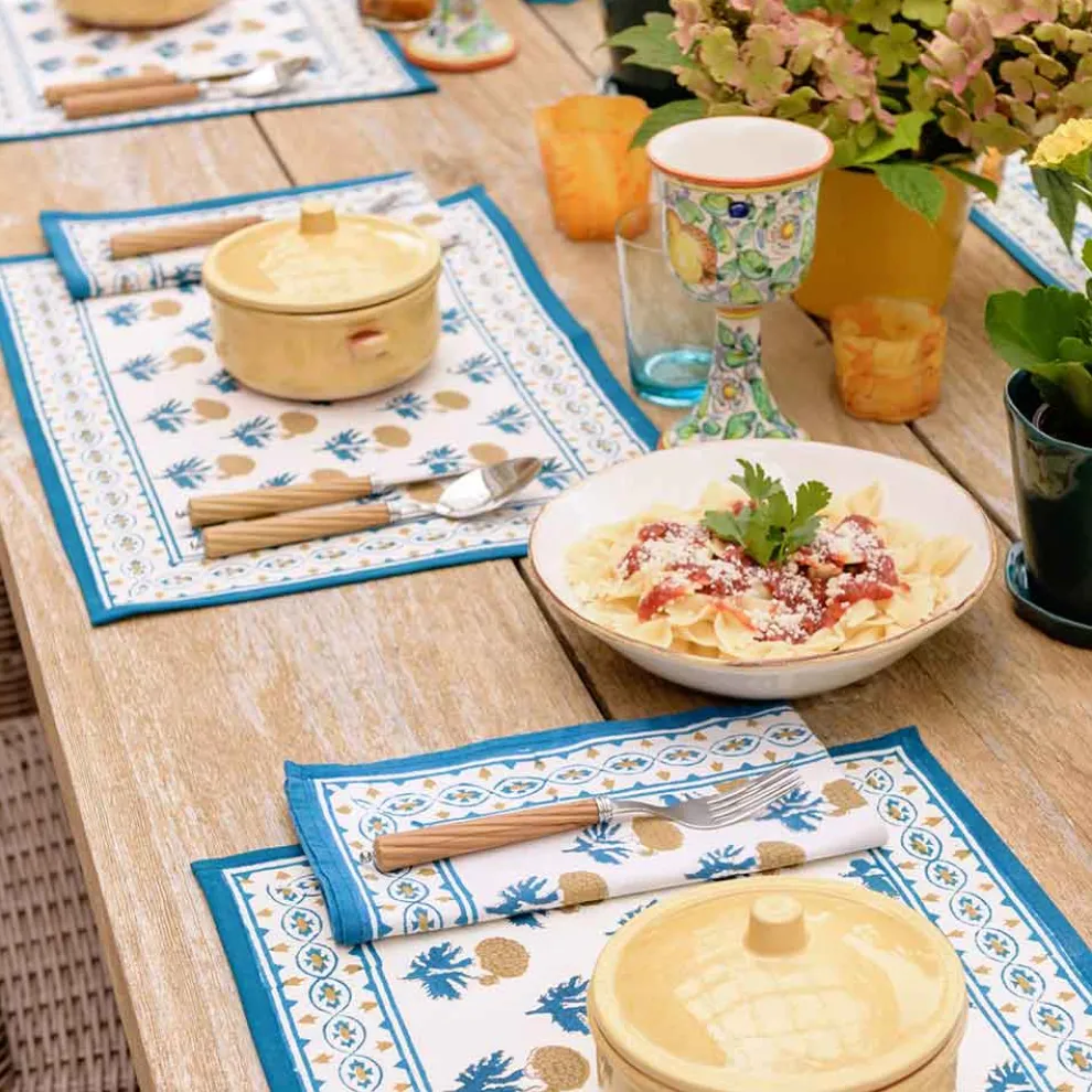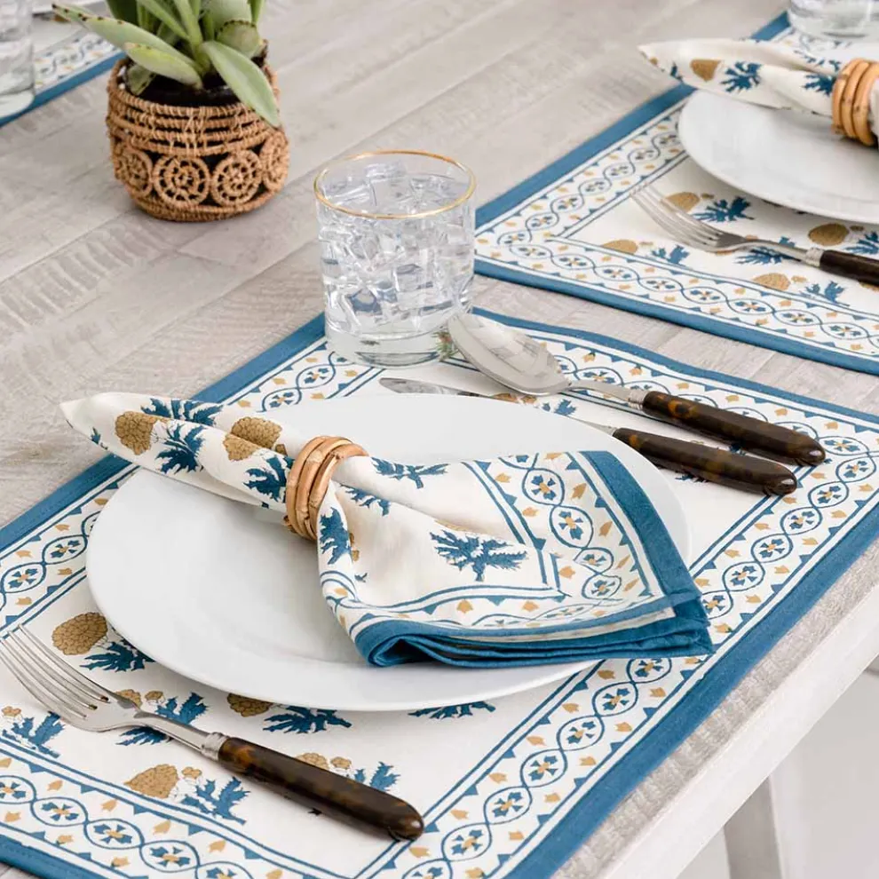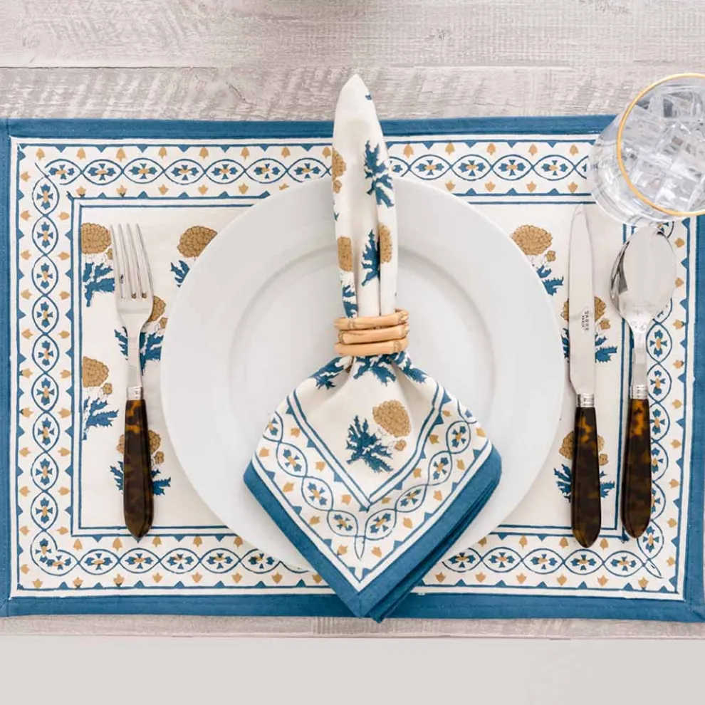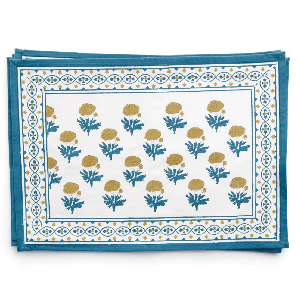 Named after an ancient and holy city in India, our Gaya Teal & Marigold placemat capture the splendor, mystery and beauty of the Asian subcontinent. Printed by hand using rich dyes and carved wooden blocks to achieve a one-of a-kind design, these cotton dinner napkins make a striking display on your formal tabletop.