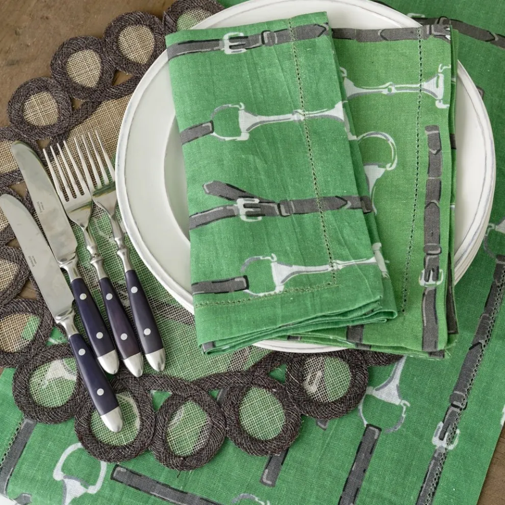 Introducing our Green Linen Snaffle & Buckle Napkins, a stunning fusion of sophistication and equestrian charm that adds a touch of timeless style to your dining experience. As featured on TODAY, these exquisite linen napkins feature an intricate snaffle and buckle print in classic white and black, beautifully showcased against a lush green backdrop.