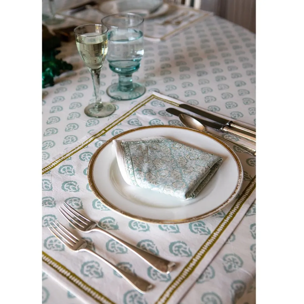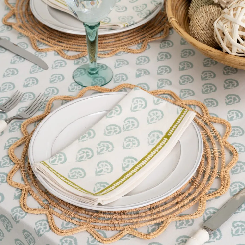 This beautiful set of 100% cotton hand blocked printed napkins in CarnationSeafoam is intended to be mixed haphazardly together with the other patterns, just as our families are.