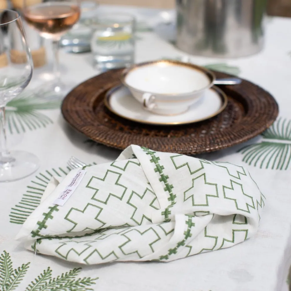 The India Hicks Home Embroidered Grand Cross napkins are embroidered in India by skilled artisans using hand-guided embroidery techniques. The beautiful cotton blend fabric has a slight stretch and resilience to it, creating a keepsake that can be brought out for your favorite dinner guests for years to come.
