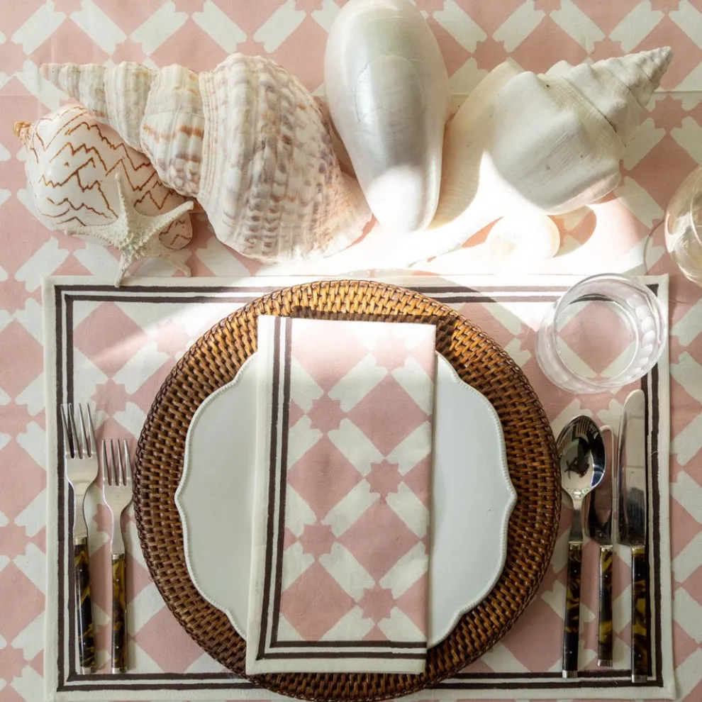 The Love Story table linen collection is made to mix and match, pair your favoritenapkins andtableclothpatterns insoft blush and rich chocolate brownand bring your tablescape to life. Explore this beautiful table linen collection by India Hicks Home.