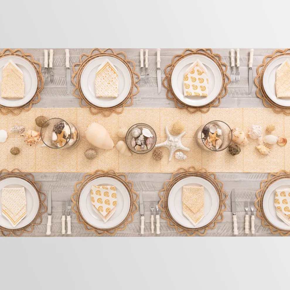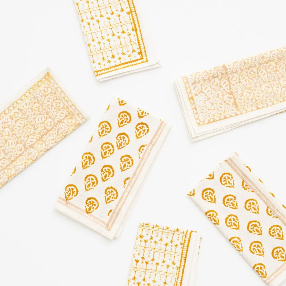 This beautiful mixed set of 100% cotton hand blocked printed napkins in goldenare intended to be mixed haphazardly together, just as our families are.