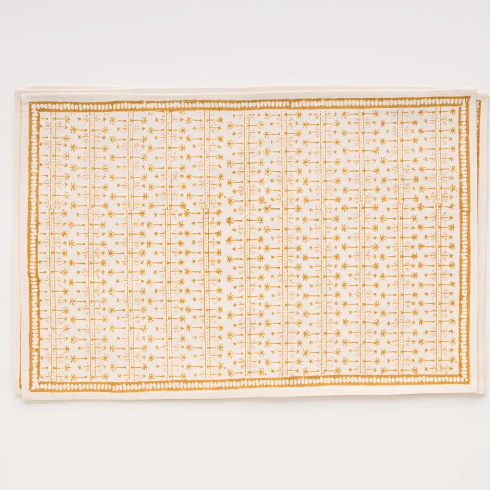 This beautiful set of 100% cotton hand blocked printedplacemats in Palm AvenueGolden is intended to be mixed haphazardly together with the other patterns, just as our families are.