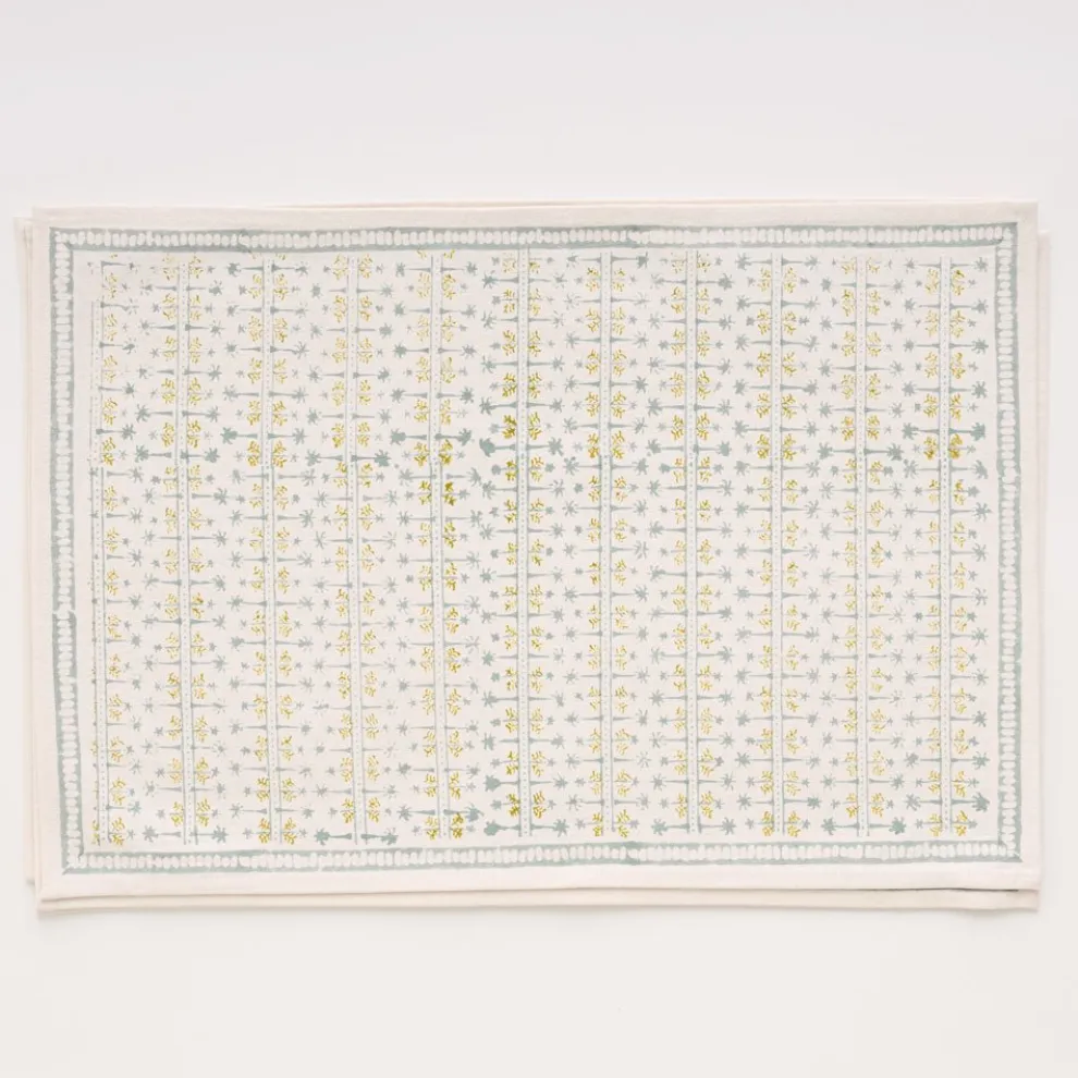 This beautiful set of 100% cotton hand blocked printedplacemats in Palm AvenueSeafoamis intended to be mixed haphazardly together with the other patterns, just as our families are.
