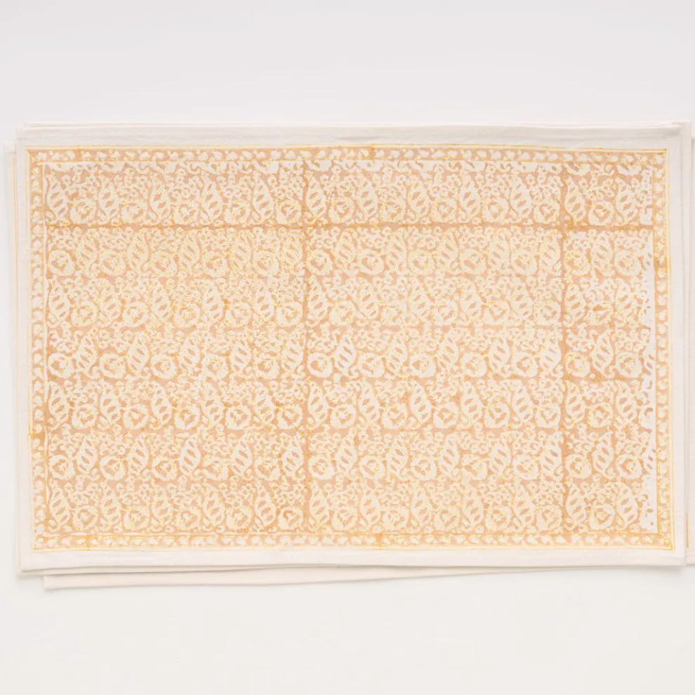 This beautiful set of 100% cotton hand blocked printedplacemats inSeashellGolden is intended to be mixed haphazardly together with the other patterns, just as our families are.