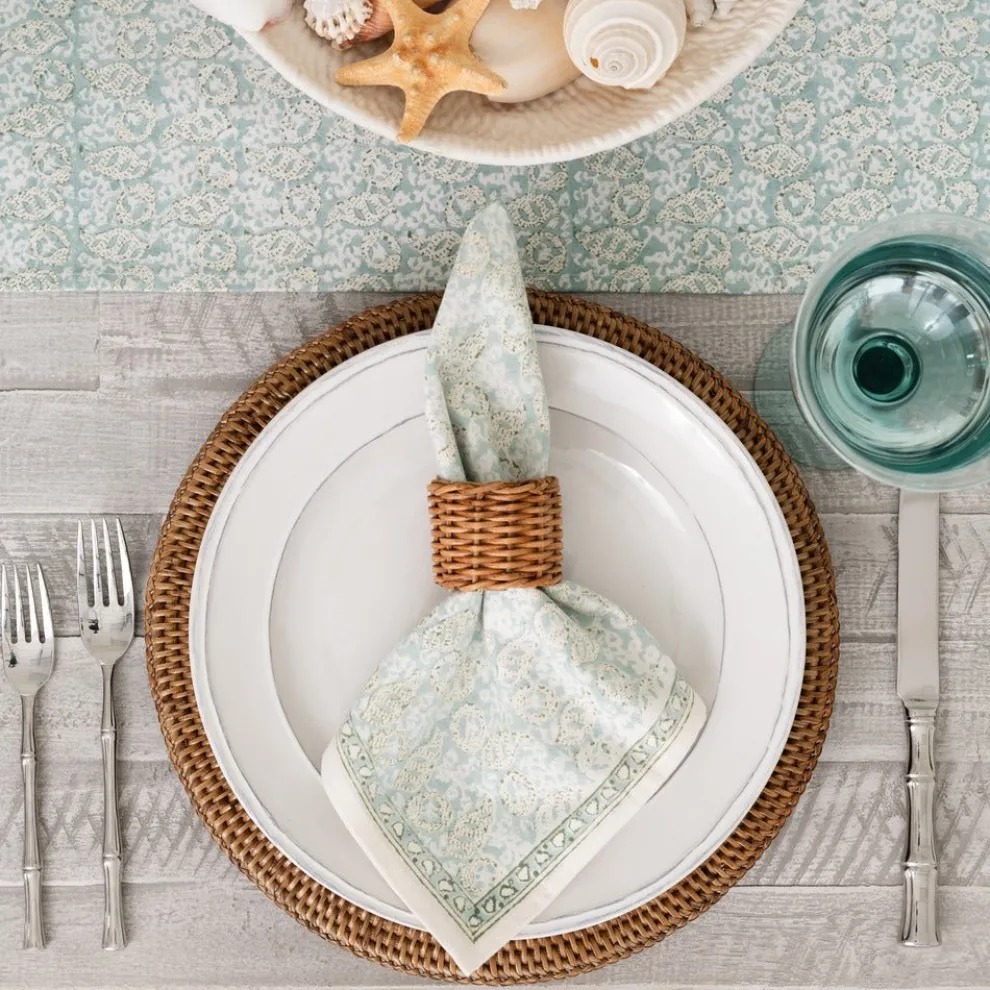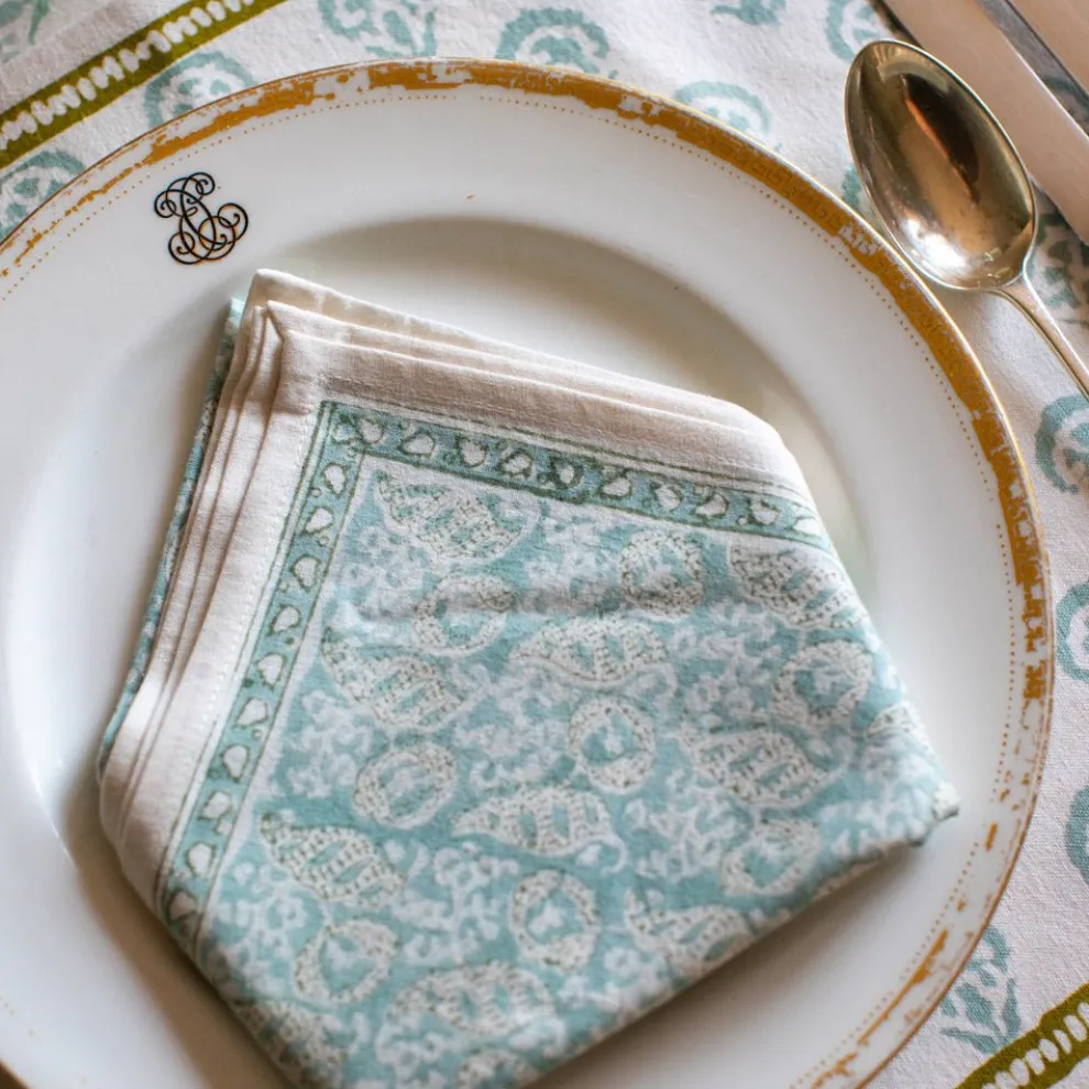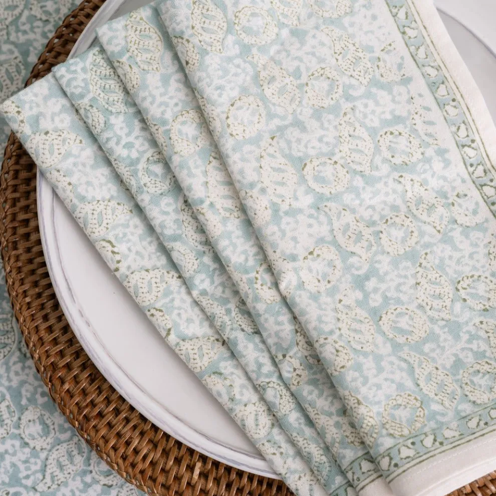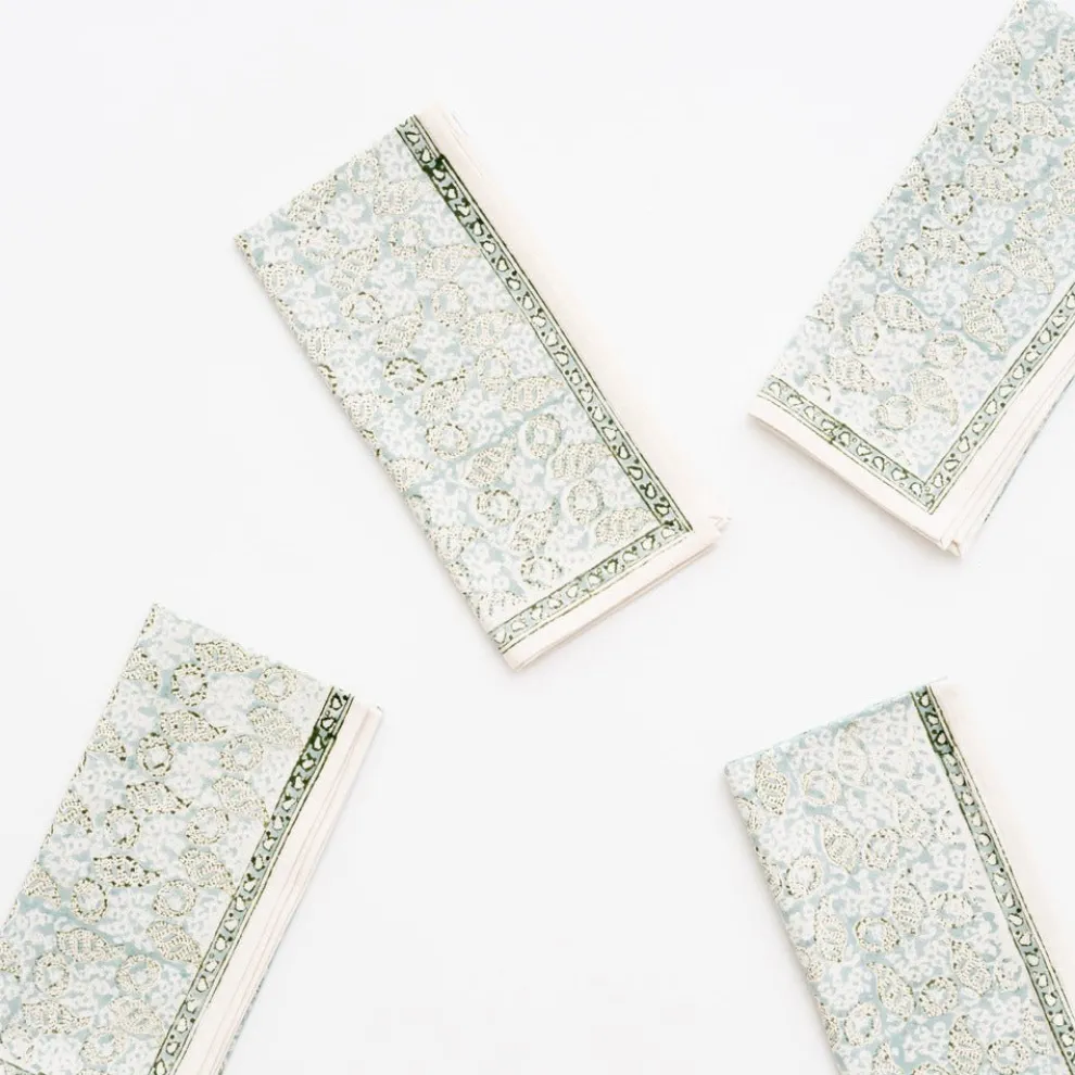 This beautiful set of 100% cotton hand blocked printed napkins inSeashellSeafoamis intended to be mixed haphazardly together with the other patterns, just as our families are.