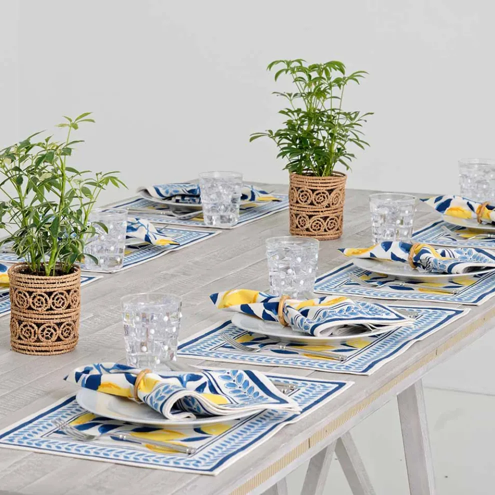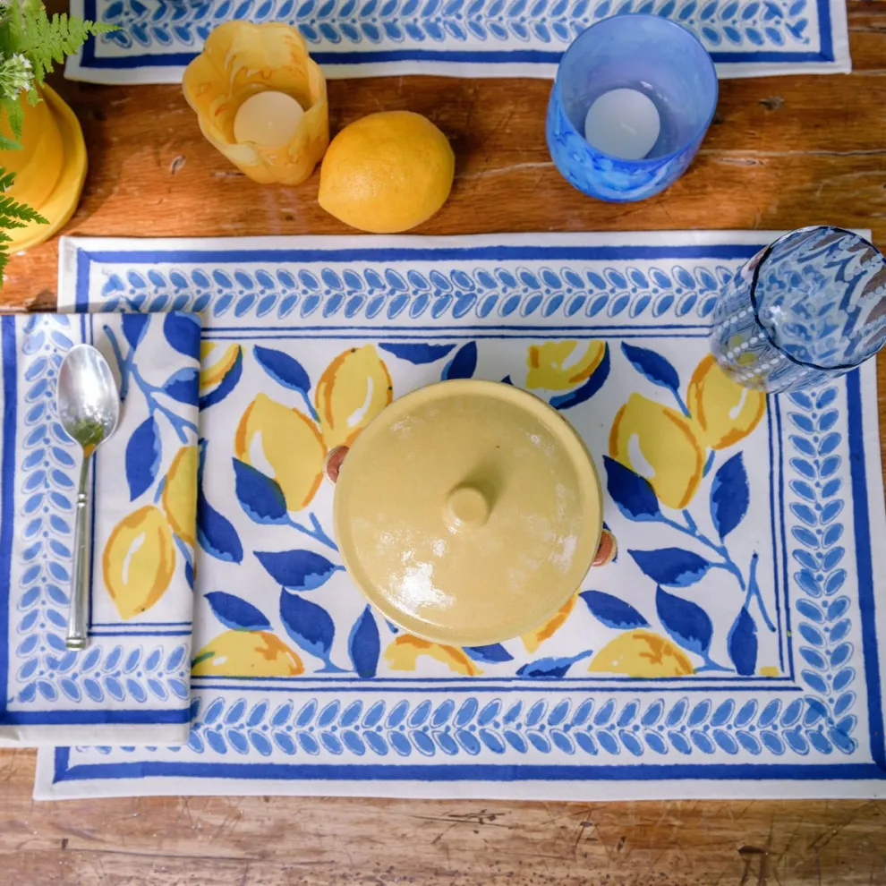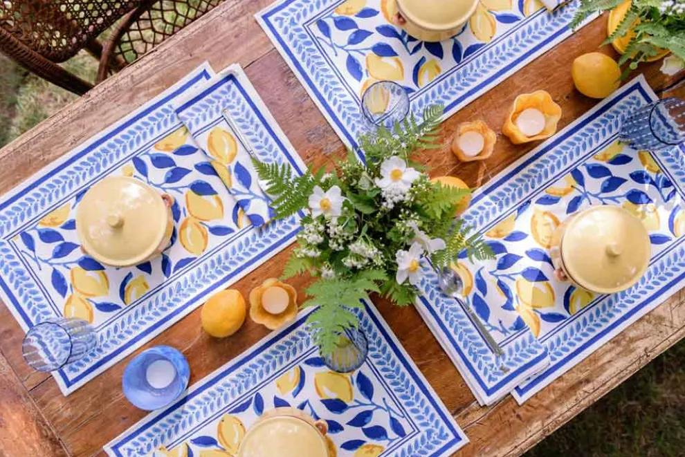 Vibrant yellow lemons on rich navy branches make up this cheerful, block-printed pattern. A cool pitcher of lemonade will look right at home amongst these placemats, which pair beautifully with their matching napkins or solid navy linen napkins.