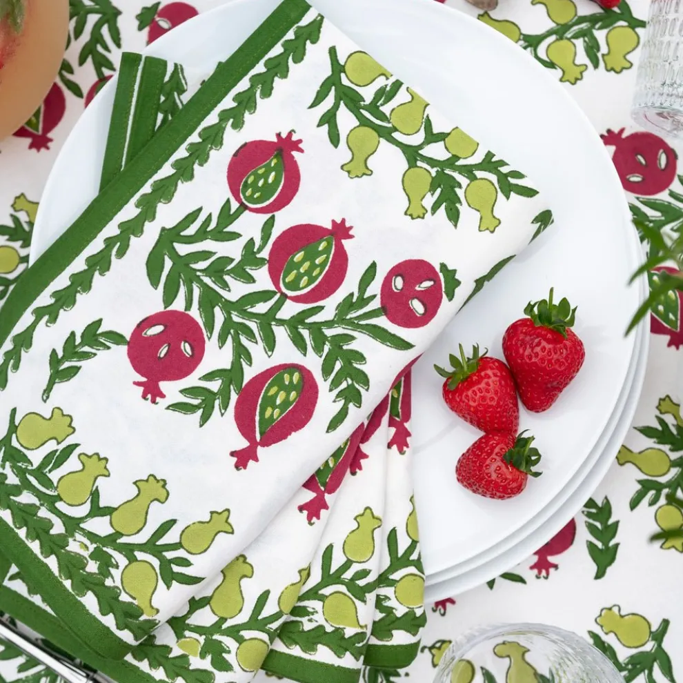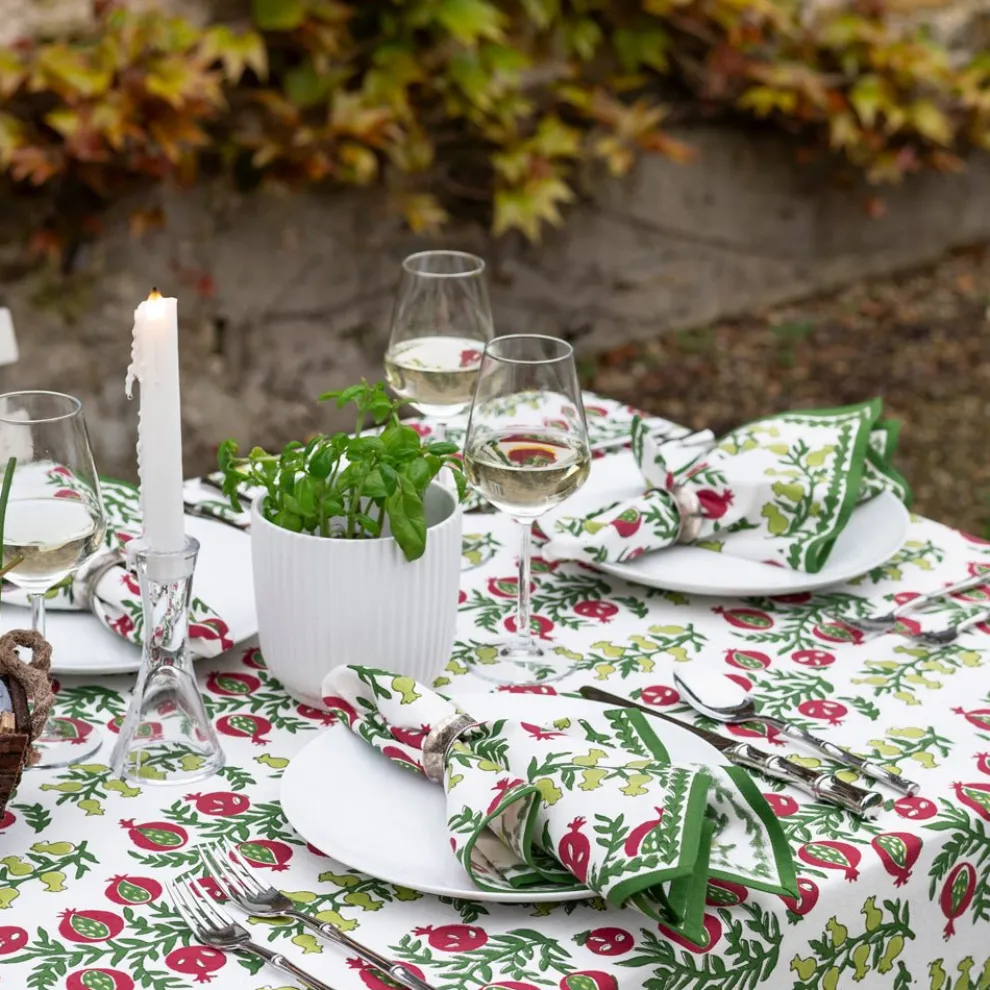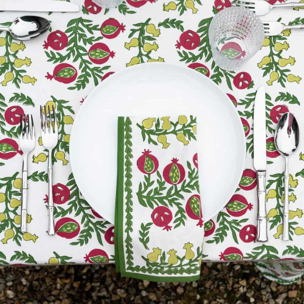 These cheerful hand block printed napkins will brighten up your table and cheer up your day. Perfect for casual everyday use as well as entertaining and gatherings with family and friends. Inside, outside, in the garden and up in the mountains, they fit in everywhere! Pair with matching tablecloth and placemats to complete the elegant yet casual look.