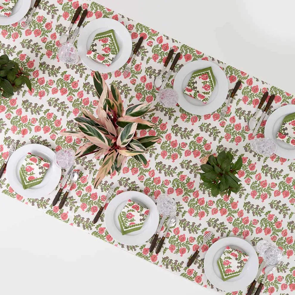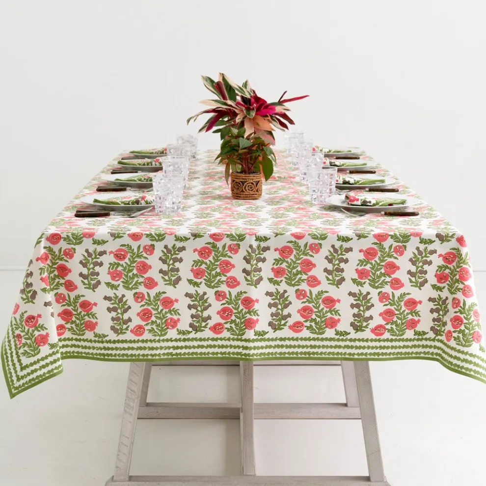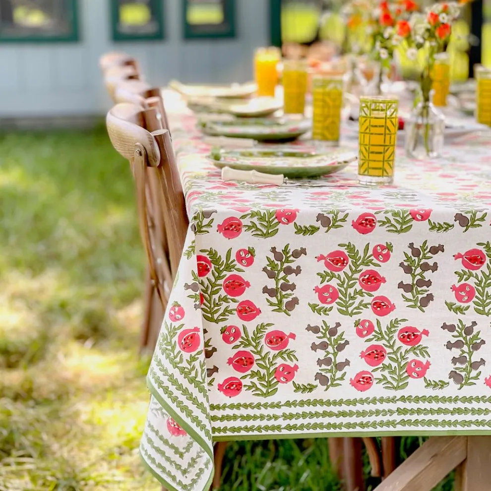 The sweet shape of young pomegranates inspired this print, which features the fruit in both its baby and mature stages. Lively tree branches with vibrant green leaves end with plump pomegranates in coral and salmon hues. This tablecloth pairs beautifully with the Pomegranate Green napkins and Natural Bamboo Cane Placemats.
