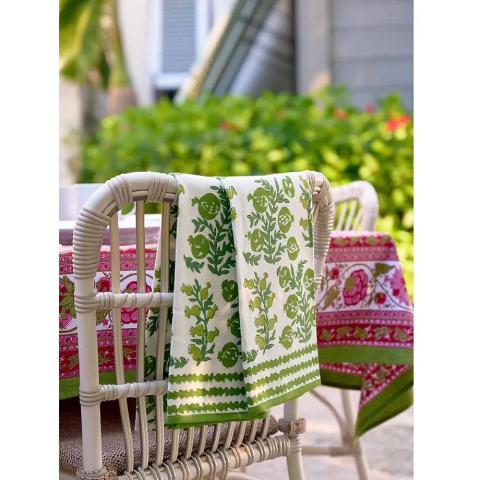 “What are Pom Bells”? you ask…well, those baby buds do look like bells don’t they? Re-imagined every season in at least one new colorway, this cheerful design is a nod to ancient turkish wall hangings as well as hand applique repeats. Each version sets a new tone, surpising us all when palettes are finalized. This elegant version in classic shades of green. is understated and elegant, happy and relaxed.