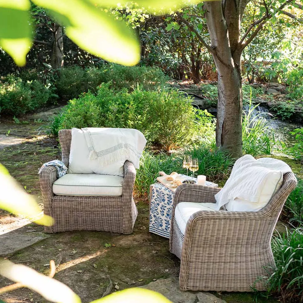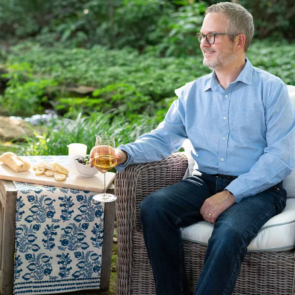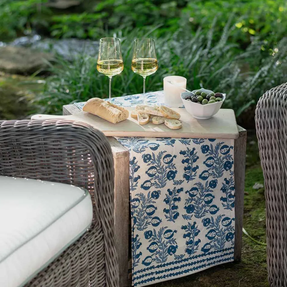The sweet shape of young pomegranates inspired this print, which features the fruit in both its baby and mature stages. Lively branches with pale blue leaves end with plump pomegranates in more shades of blue. This table runner pairs beautifully with Natural Bamboo Cane Placemats and Melograno Wedgewood napkins.