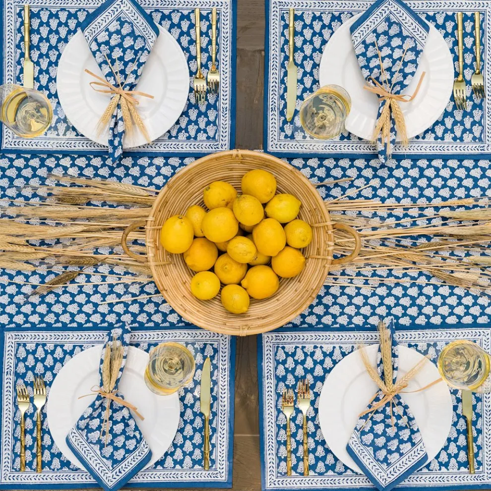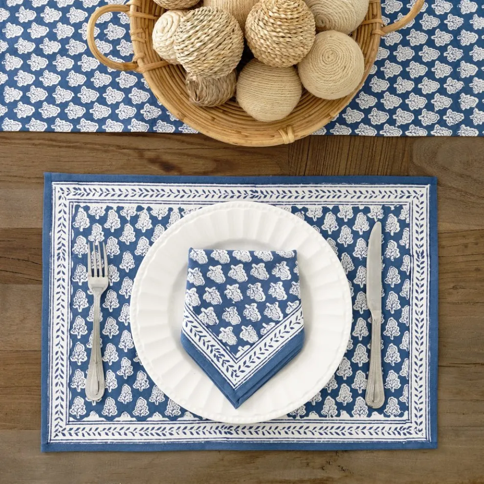 Our Pom Buti Denim Placemats are more than just a practical choice; they’re a canvas for your creativity and a way to express your personal style.These placemats feature a serene blue background adorned with a delicate white floral design, creating a captivating and timeless look that enhances any dining experience.