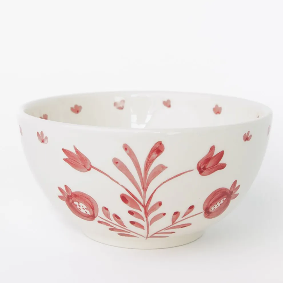 Serve soups, salads, or snacks in the charming Pomegranate Duet Rose Bowls. With hand-painted pomegranate motifs and botanical accents in a soft rose pink palette, these bowls add a fresh and elegant touch to any table. Available as a set of 2, these bowls are a perfect blend of style and practicality.