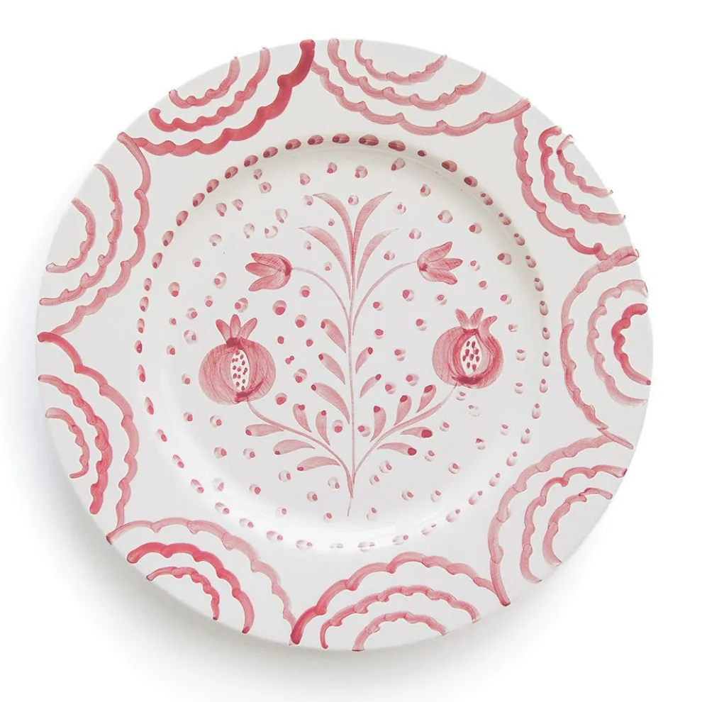 Bring a bit of whimsy to your dinner table with our hand-painted ceramic Pomegranate Duet Rose Dinner Plates. Each plate was designed by Pomegranate founder and creative director, Angela Beck, and perfectly pairs with our colorful table linen collections. The Duet design features two hand-painted pomegranates accompanied by graceful floral accents in soft rose pink tones. The carefully crafted design offers a delicate yet bold style, perfect for dinner parties, luncheons, and family meals. Style with matching Pomegranate Duet Rose Salad Plates and Appetizer Plates to complete the look!