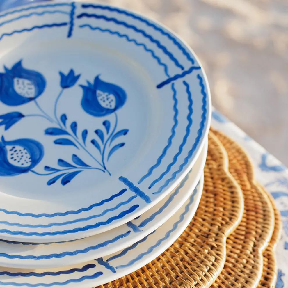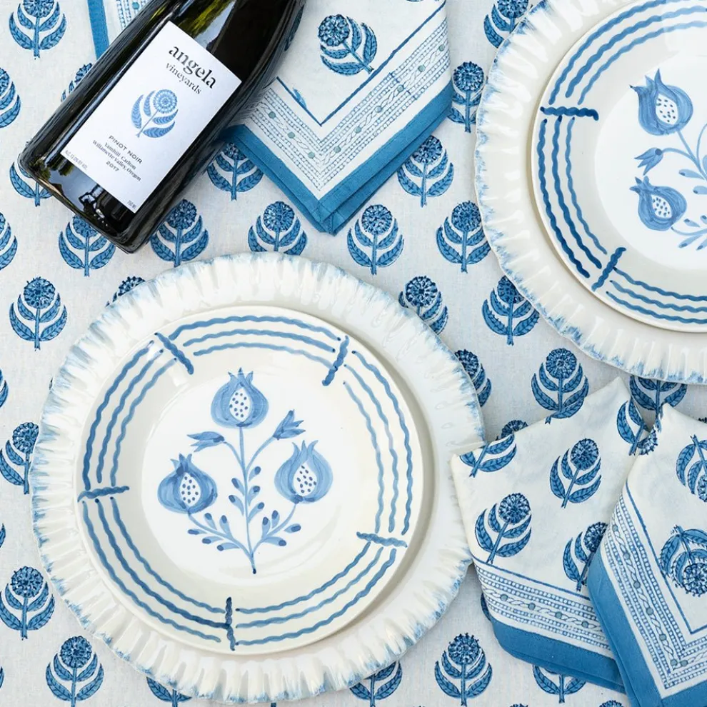 These hand-painted ceramic Pomegranate Trio Sketch Cobalt Blue Salad Plates are a timeless classic. Designed by Pomegranate founder and creative director, Angela Beck, the hand-painted pomegranate designs are framed by flowing, decorative cobalt blue lines that frame the plate perfectly. The set of 2 salad plates are perfect for serving salads, side dishes, or desserts. The bold pattern makes a striking statement, complementing any table setting. Pair with matching Pomegranate Trio Sketch Dinner Plates or Appetizers Plates to complete the look!
