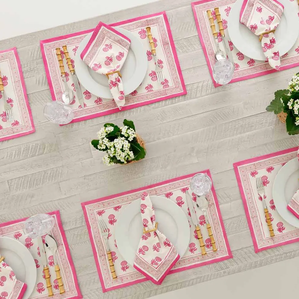 Our latest exclusive rose pink and white print is refreshing yet cool. traditional and exotic, all at the same time. Cheer up your table with the bright pink and white updated Indian motif placemat, and pair with matching napkins and table runners. A perfect gift for your mom, best friend, neighbor…oh, and for you!