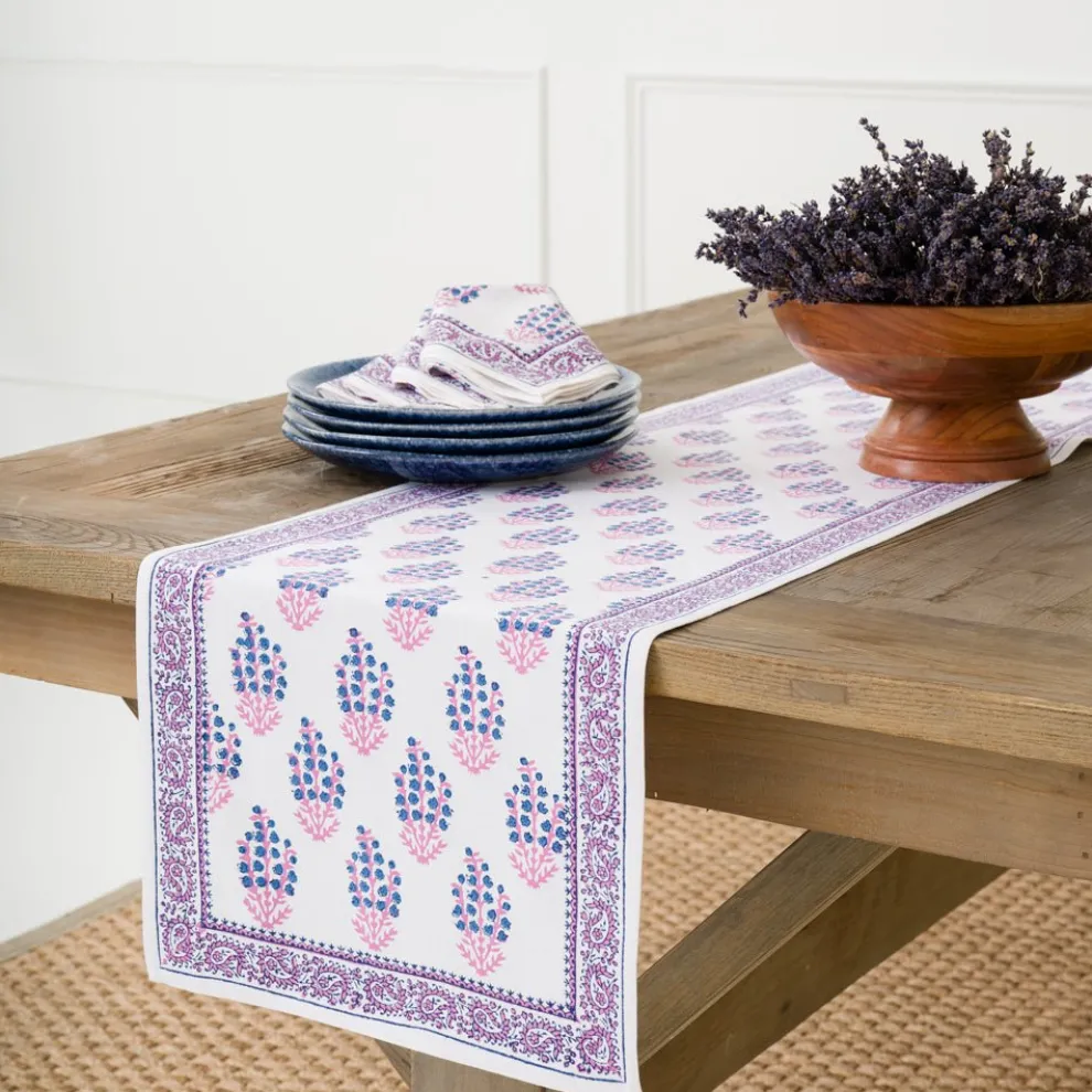 Bring a piece of India to your table with our Sagar Blue & Magenta Table Runner. Inspired by the vibrant culture of the Sagar District, our captivating print draws from the region’s beautiful architecture and nature. Rich blue and vibrant magenta colors create a tranquil yet luxurious atmosphere.