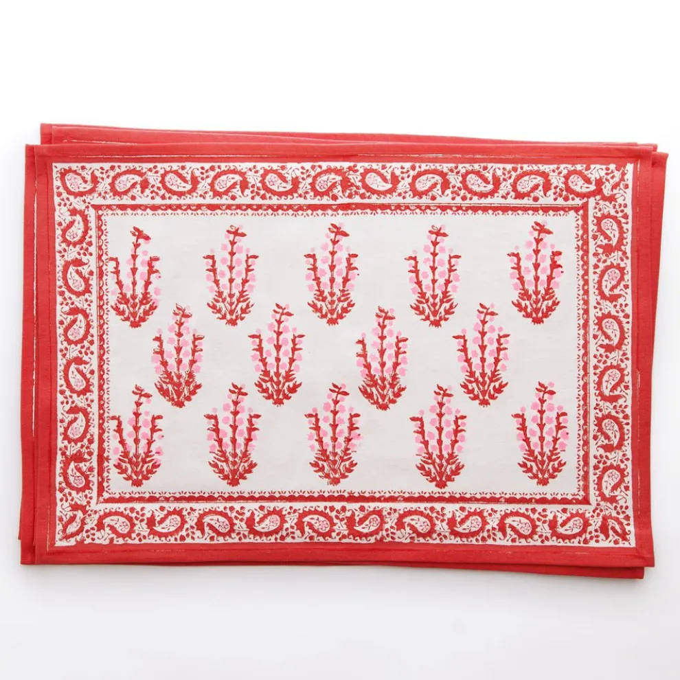 Make your table setting truly stand out with the Sagar Red & Pink Placemats. Highlighted by a stunning floral pattern framed with a paisley border, these hand block-printed placemats deliver an artisanal touch to your dining space. Ideal for hosting or adding elegance to daily meals, these placemats combine beauty and functionality.